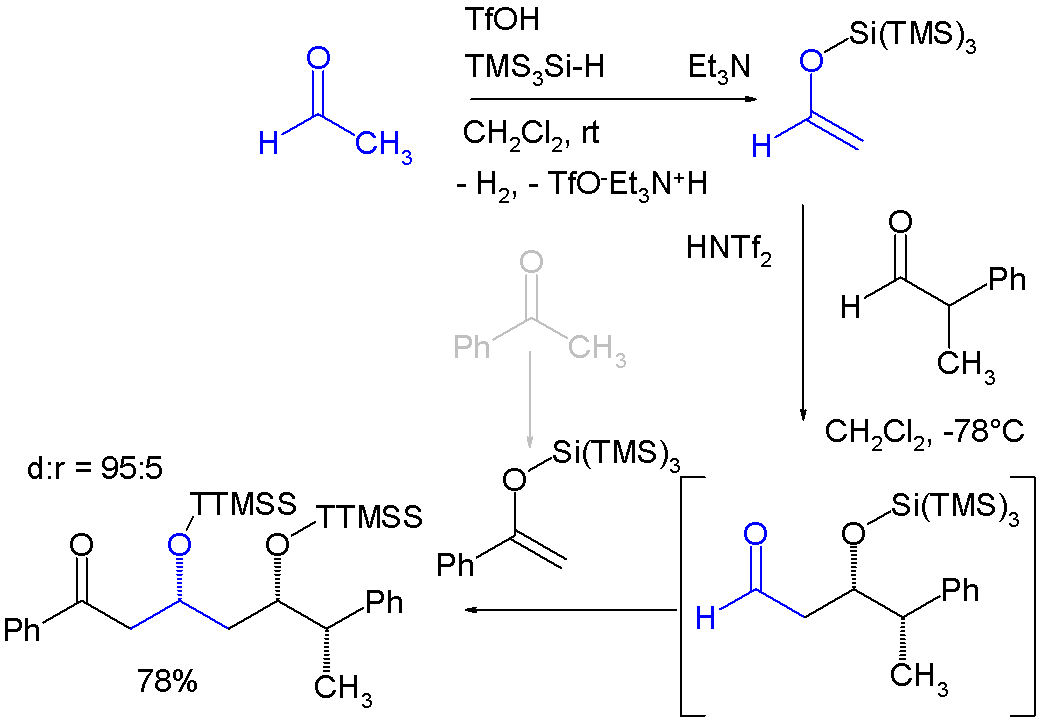 The starting materials are acetaldehyde and benzophenone which are both converted to silyl enol ether by reaction with tris(trimethylsilyl)silane and triflic acid with evolution of hydrogen. The aldol reaction is catalyzed by Bistriflimide|bis(trifluoromethane)sulfonimide