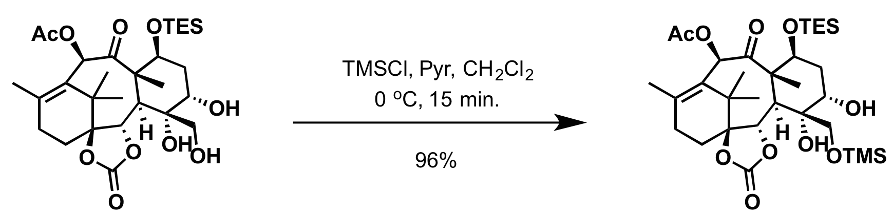 - 트라이메틸실릴 클로라이드 (TMSCl) 또는 트라이메틸실릴 트라이플루오로메탄설포네이트 (TMSOTf) 및 염기 (예: 피리딘, 트리에틸아민, 또는 2,6-루티딘)를 다이클로로메테인에 용해