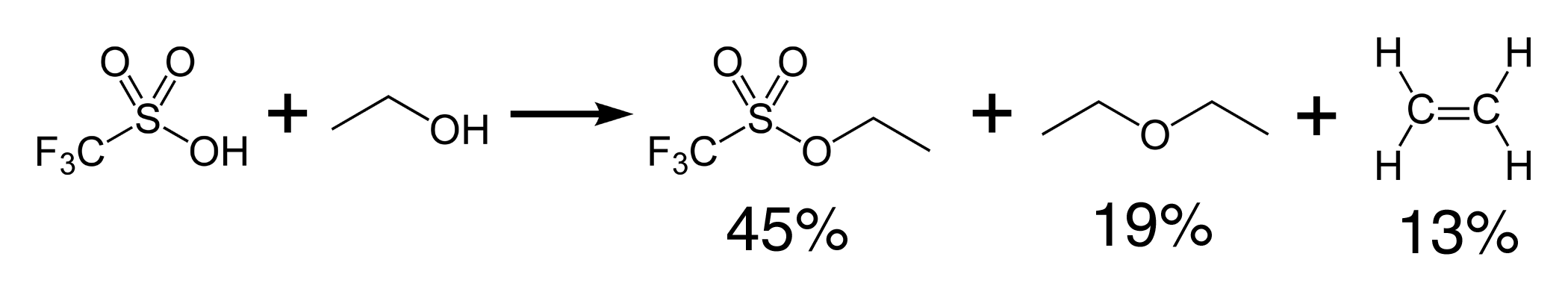 트라이플루오로메테인설폰산은 알코올과 발열 반응하여 에테르와 올레핀을 생성한다.