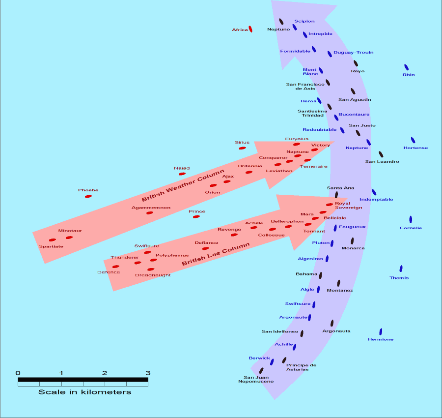 트라팔가르 해전에서 영국 함대는 프랑스-스페인 연합함대에 결정적인 승리를 거두었다.[49] 이 해전으로 영국은 19세기 대부분의 기간 동안 해상 지배권을 확립하여 무역을 보호하고 대영 제국을 유지할 수 있었다.[100] 반면, 나폴레옹의 영국 침공 계획은 좌절되었다.[33]커트버트 콜링우드 제독과 넬슨 중장이 이끄는 영국 함대는 카디스에서 프랑스-스페인 연합함대를 봉쇄했다.[39][40] 넬슨은 함대를 여러 부대로 나누어 적의 전열을 끊고 난전을 유도하는 전술을 사용했다.[42] 이 전술은 나일 해전과 코펜하겐 해전 등에서 얻은 경험을 바탕으로 한 것이었다.[42]