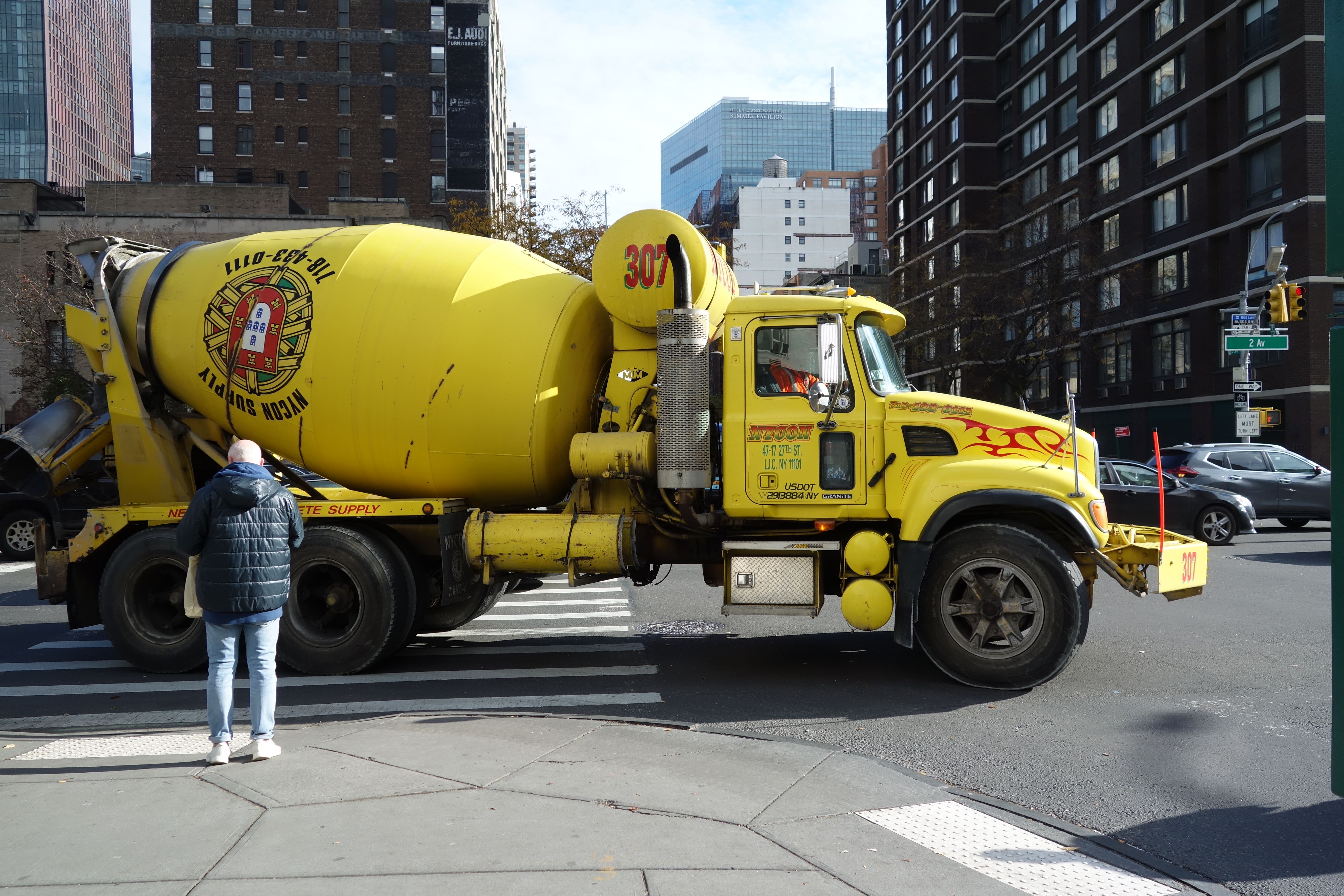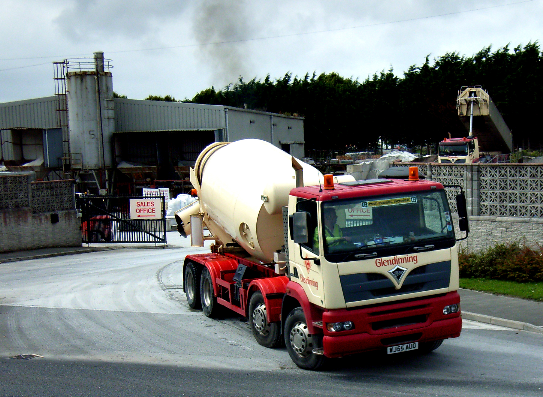 - 콘크리트 믹서 트럭은 경사진 축에 회전 드럼이 있으며, 한 방향으로 회전하여 혼합하고 다른 방향으로 회전하여 콘크리트를 슈트 아래로 배출한다.