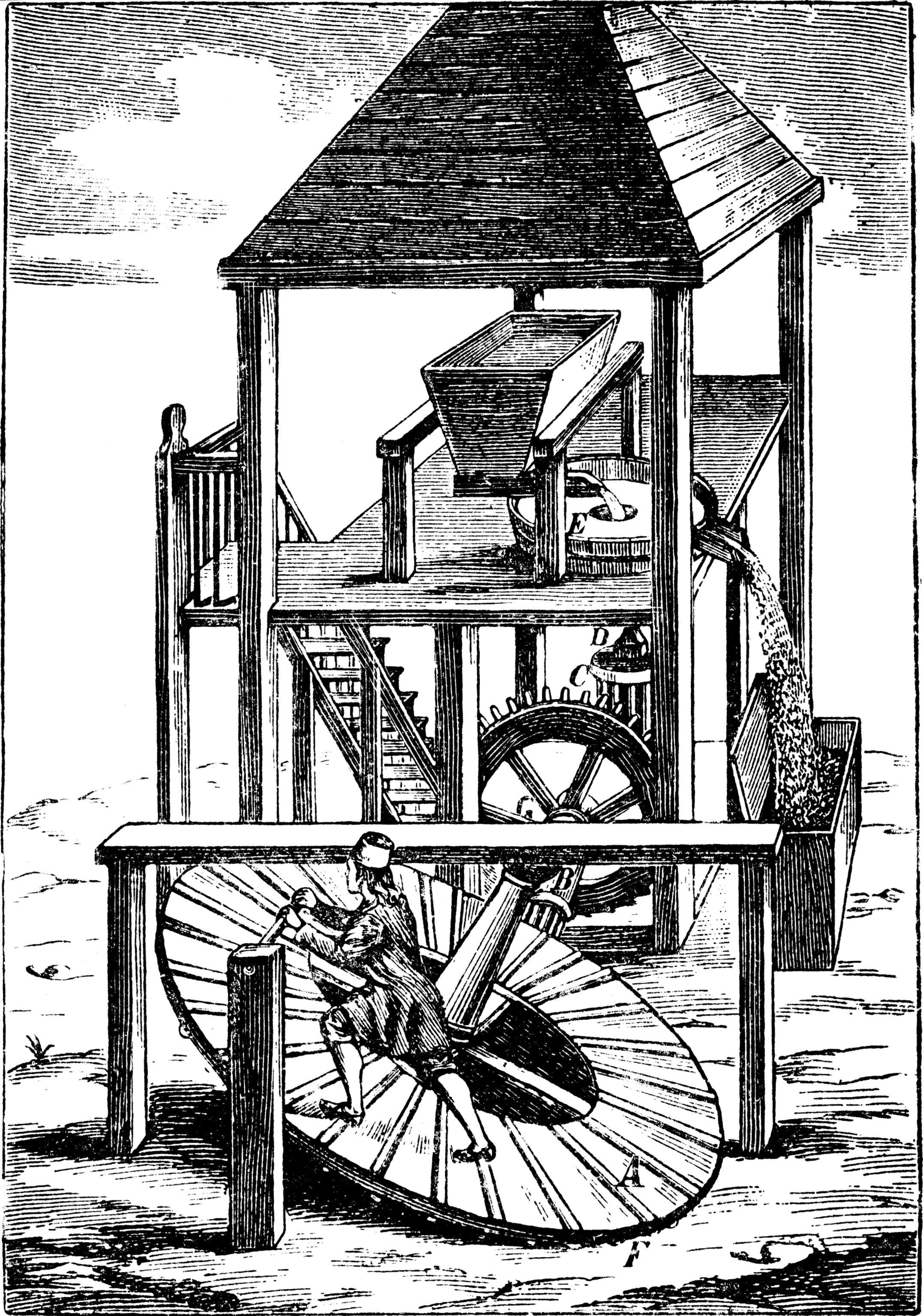 1817년, 영국의 엔지니어 윌리엄 큐빗은 베리 세인트 에드먼즈 감옥의 죄수들을 교정하기 위해 '처벌용 트레드밀'을 도입했다.[6] 이 트레드밀은 죄수들이 끝없는 계단을 오르듯 밟아 돌리는 방식으로 작동했다. 1865년 교도소법에 따라, 16세 이상의 남성 죄수는 최소 3개월 동안 트레드밀을 이용하는 강제 노동을 해야 했다.[7] 이들은 하루 6시간 이상, 1500~4000m의 수직 거리를 올라야 했다. 브릭스턴 감옥에서는 이 기계를 사용하여 곡물을 빻기도 했다.[9]