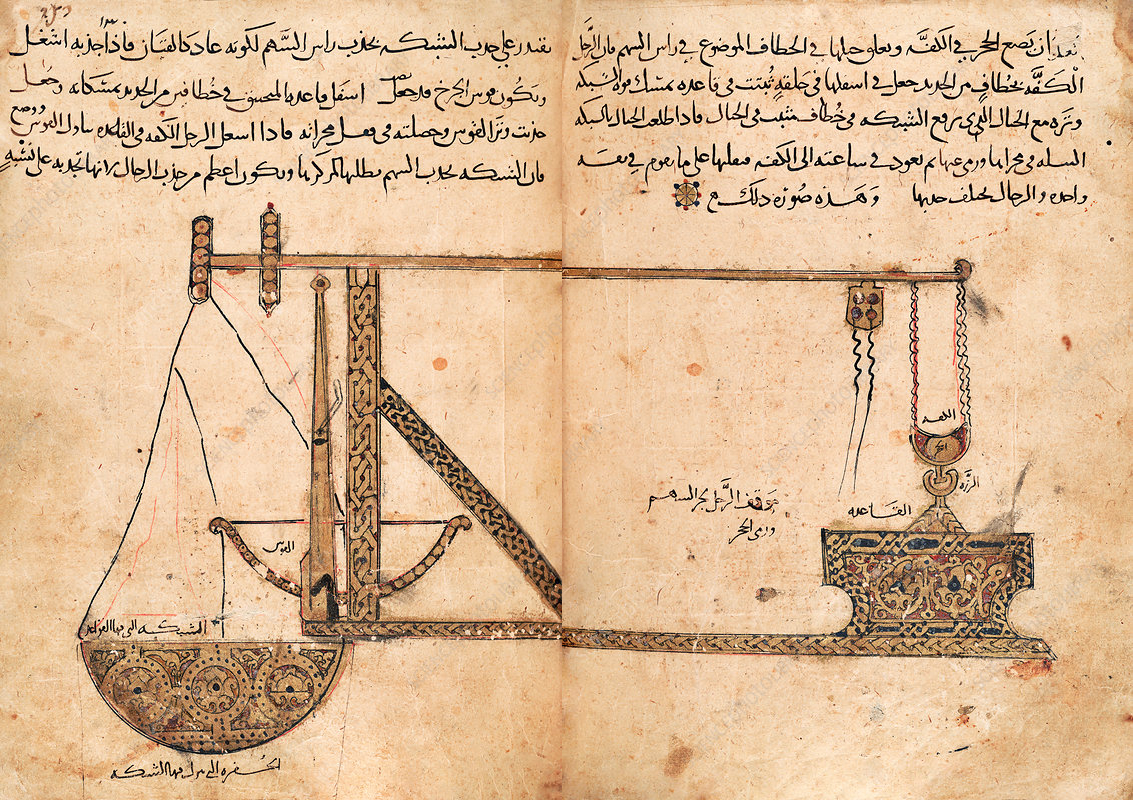 "중세 시대 가장 강력한 무기"로 묘사되는 평형추 투석기의 기원과 시기에 대해서는 정확히 알려진 바가 없다. 평형추 투석기에 대한 최초의 기록은 1187년 살라딘의 정복에 대한 마르디 이븐 알리 알-타르수시의 해설에서 찾을 수 있다.[21][22]