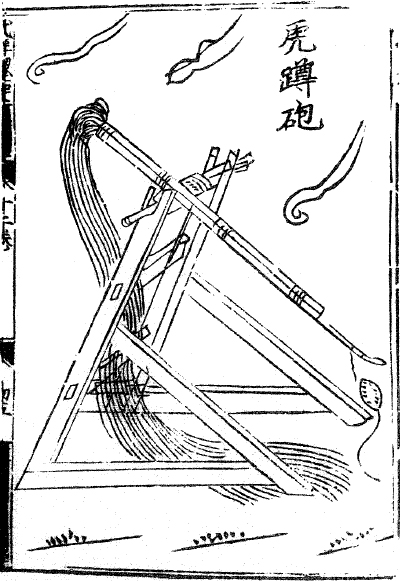 서기 1세기경, 해설가들은 ''좌전''과 ''시경''과 같은 텍스트의 다른 구절을 견인식 트레뷰셋에 대한 언급으로 해석했다. "궤(guai)는 '돌을 올려놓은 나무의 큰 팔'이며, 이 장치[ji]를 통해 발사되어 적을 쓰러뜨린다." ''사기''에는 "날아가는 돌의 무게는 12근이며, 장치[ji]를 통해 300보를 날아간다."라고 기록되어 있다. 견인식 트레뷰셋은 한나라 시대에 평화로운 기간이 길어짐에 따라 쇠퇴했지만, 삼국 시대에 다시 일반적인 공성 무기가 되었다. 다음 세기에는 일반적으로 돌 던지는 기계, 뇌차(thunder carriages), 돌 수레(stone carriages)라고 불렸다. 서기 573년에는 적의 요새를 공격하기 위해 배에 설치된 무기로 사용되었다.