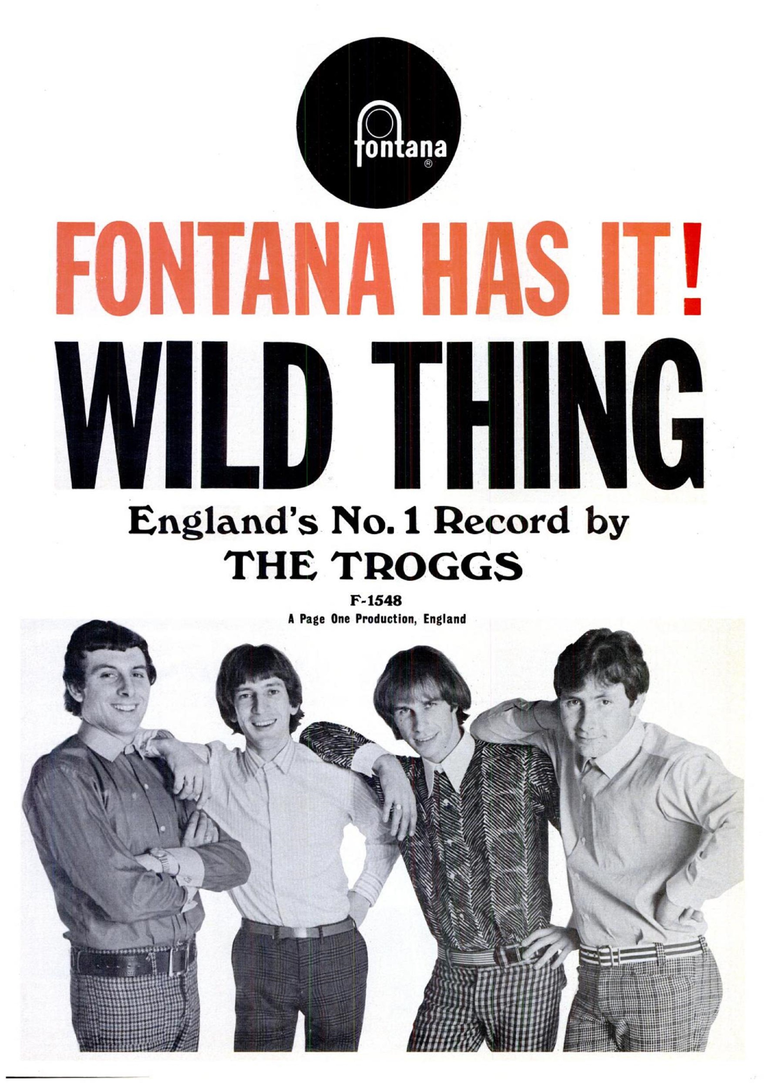 트로그스(The Troggs)는 리드 보컬 Reg Presley와 드럼 Ronnie Bond가 어린 시절 친구로, 1960년대 초반 앤도버에서 R&B 밴드를 결성하며 시작되었다.[7] 1964년에는 베이스 Pete Staples와 기타 Chris Britton이 합류하여 트로그스가 되었다.[7] 1966년 2월, 더 킨크스(The Kinks)의 매니저인 래리 페이지와 계약을 맺고,[8] Page One Records에서 녹음했으며, 페이지는 데뷔 싱글 "Lost Girl"을 위해 CBS에 그들을 임대했다.[3]그들의 가장 유명한 히트곡은 싱글 "Wild Thing"으로, 텔레비전 프로그램 ''Thank Your Lucky Stars''에 노출되면서 1966년 7월 영국에서 2위(Reg Presley의 노래 "From Home"은 B 사이드), 미국에서는 1위를 차지했다. 단순한 헤비 기타 리프와 아양 떠는 가사의 조합, 그리고 오카리나 솔로는 이 곡을 차고 록의 기준으로 만들었다.[9] 그러나 밴드는 1968년까지 미국 투어를 하지 못해 미국에서의 성공에 한계가 있었다.[21]