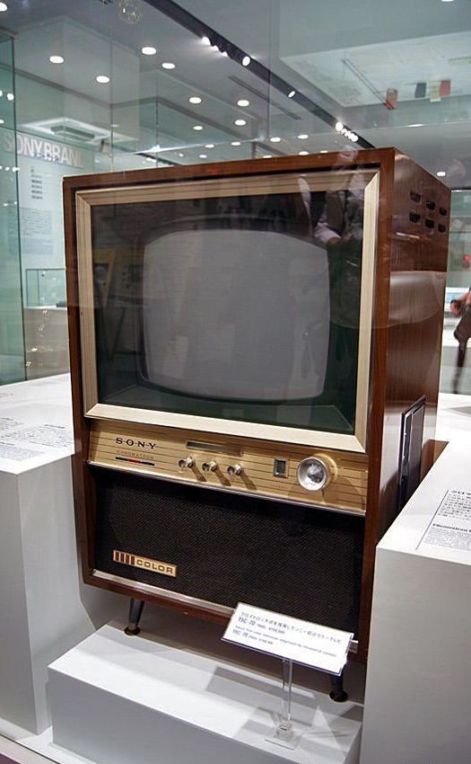 1968년 소니는 독자적으로 개발한 트리니트론 방식을 적용한 컬러 텔레비전을 출시했다. 트리니트론은 기존의 RCA가 개발한 그림자 마스크 방식의 3개의 전자총과 달리, 1개의 전자총에서 3개의 구멍이 있는 제어 그리드를 통해 빨강, 초록, 파랑의 세 전자빔을 형성하여 하나의 전자 렌즈와 전자 프리즘으로 전자빔을 집속시키는 방식이었다.[14] 고해상도를 구현할수록 화면이 어두워지는 그림자 마스크 방식에 비해 훨씬 더 높은 화질 구현이 가능했던 트리니트론은 고화질 영상에 대응하는 최적의 디스플레이로 세계시장에서 호평을 받았고, 이후 소니는 세계 TV 시장의 선두를 차지하게 되었다.[14] 트리니트론은 워크맨, 핸디캠과 함께 20세기 소니를 상징하는 대표적 상품 중 하나였다.최초의 트리니트론 컬러 TV는 1968년에 출시된 "KV-1310"이다. 소니는 처음에 미국 전시회를 시찰한 기술자들의 제안을 받아들여 아퍼처 그릴 방식의 크로마트론 기술을 도입했지만, 생산성이 낮아 개발에 난항을 겪었다.[32] 이 크로마트론을 철저히 개량한 결과 탄생한 것이 트리니트론이었다.[32] 이부카 마사루 소니 사장은 1968년 4월, 12인치 트리니트론(KV-1210)을 공식적으로 출시하며, 밝기, 색 재현력, 조작 간편성 면에서 당시 시판되던 어떤 상용 제품보다 뛰어난 화질을 자랑한다고 발표했다.[14] 조리개 그릴의 수직 와이어 때문에 브라운관은 거의 수직으로 평평해야 했고, 이 때문에 독특한 원통형 모양을 갖게 되었다.[14] 브라운관을 제외하고는 모두 반도체로 구성되어 GE의 Porta-color와 같은 디자인보다 훨씬 소형이고 발열이 적었다. (고전압) 회로에 3AT2 진공관이 장착되었지만, 70년대 초에 반도체로 재설계되었다.