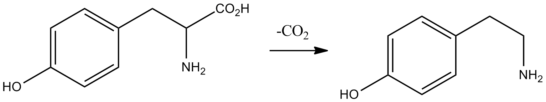 생화학적으로 티라민은 티로신 탈카복실화효소의 작용을 통해 티로신의 탈카복실화에 의해 생성된다.[36] 티라민은 ''N''-메틸티라민, ''N'',''N''-디메틸티라민 (호르데닌), ''N'',''N'',''N''-트리메틸티라민 (칸디신)과 같은 알칼로이드로 전환될 수 있다.