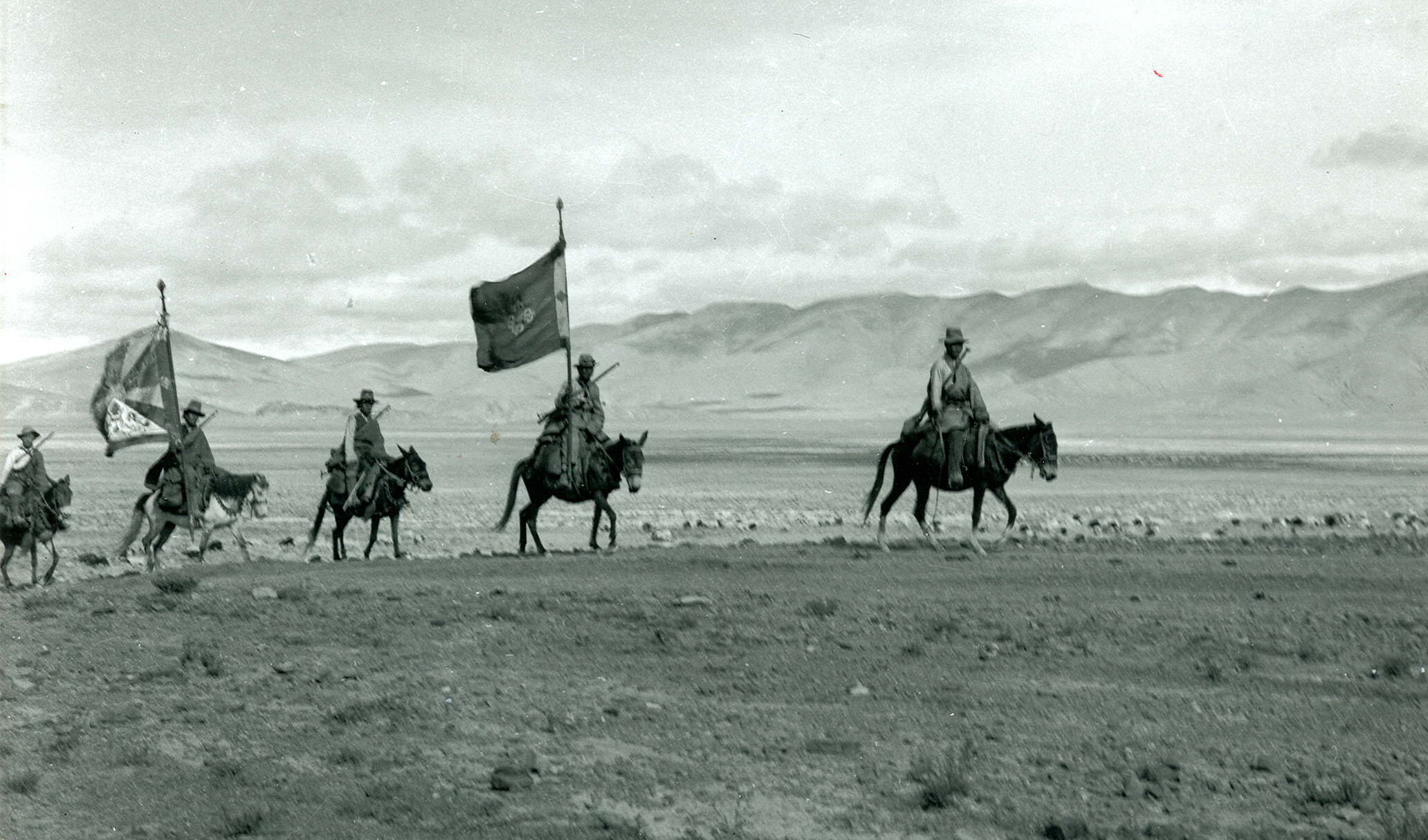 티베트군이 1938년 라사에서 열린 군사 퍼레이드에서 티베트 국기를 흔들고 있다.