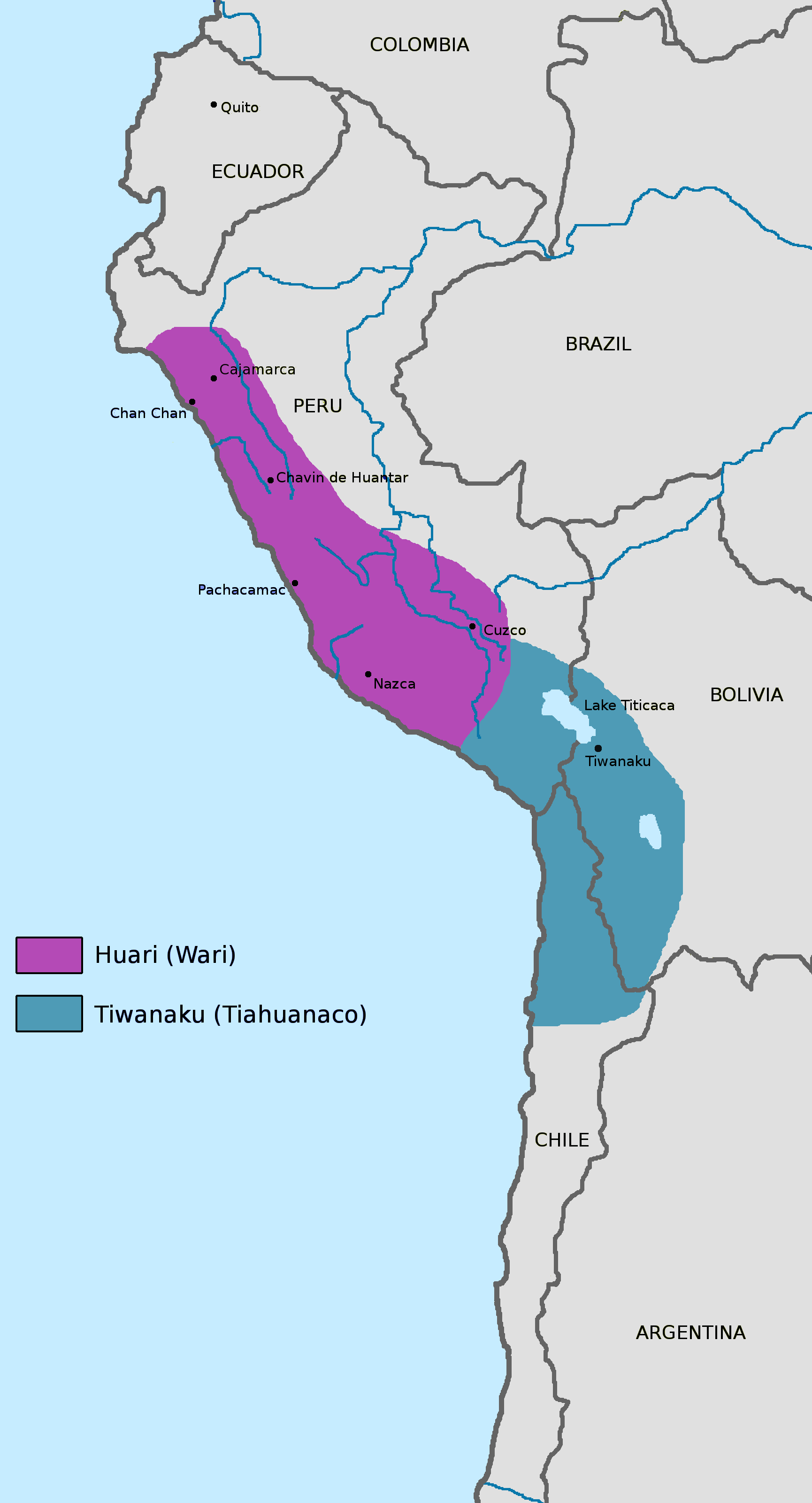 와리 문화와 티와나쿠 문명은 "남부 안데스 도상 시리즈"라고 불리는 동일한 도상학을 공유했다.[49] 두 문명 간의 관계는 무역 또는 군사적 관계였을 것으로 추정된다.[50]동시대에 현재 페루 공화국에 와리라고 불리는 정치 조직이 존재했던 것이 확인되었다. 과거에는 이 와리가 티아우아나코이드 또는 해안 티아우아나코라고 불렸지만, 현재는 티와나쿠와는 다른 정치 조직 및 문화였다고 여겨진다. 그 경계는 대략 모케과 현 부근이었다고 한다. 모케과에는 와리의 지방 유적인 세로 바울과 티와나쿠의 월경지인 오모 유적군이 있다. 이들은 각각 입지 조건이 달라서, 세로 바울은 산 정상에, 오모 유적군은 Río Osmore|오스모레 강|en|Osmore Riveres 근처의 계곡 바닥 주변에 위치한다. 양자의 구체적인 관계는 알려져 있지 않다.