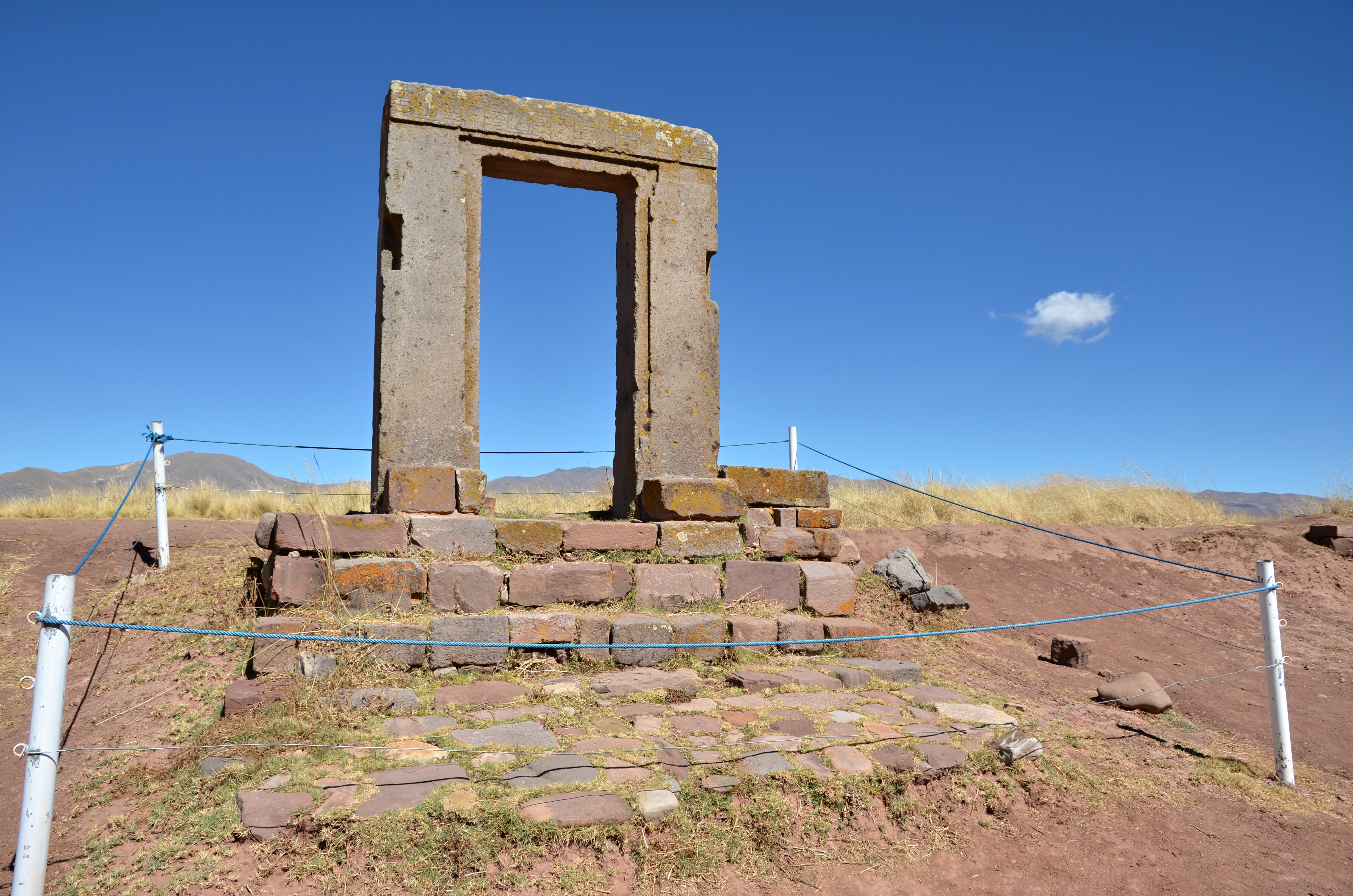 유적지의 많은 구조물에는 인상적인 문이 있는데, 기념비적인 규모의 문은 인공 언덕, 플랫폼 또는 움푹 들어간 뜰에 설치되어 있다. 한 문에는 지팡이 신 자세의 정면을 향한 인물상이 묘사되어 있다. 남부 안데스 도상학 시리즈라고 불리는 태양의 문 도상학은 여러 석조 조각, 키루, 코담배 통 및 기타 티아우아나코 유물에서 볼 수 있다.[23]