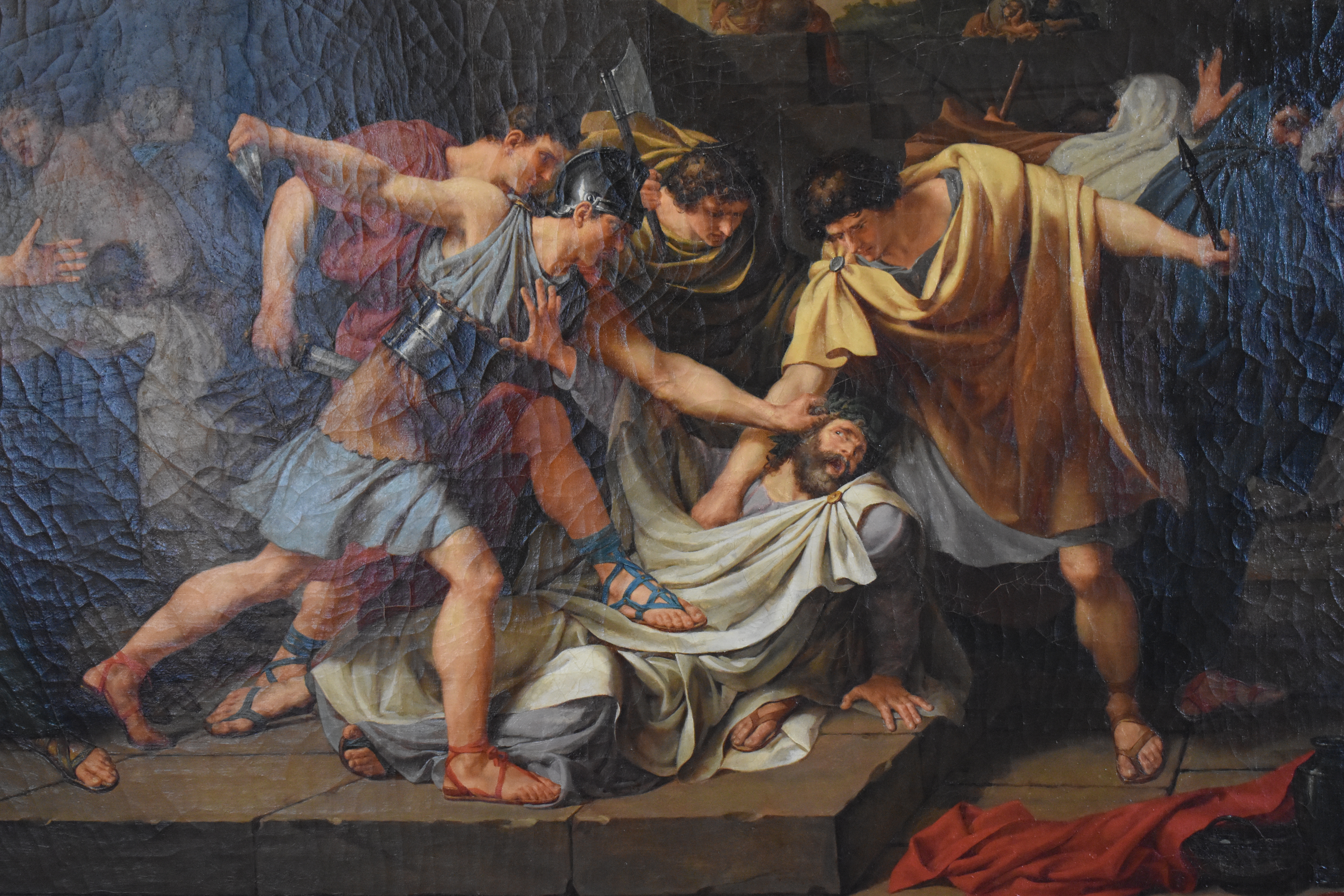 사비니 여인들의 강탈 전쟁 도중, 사비니 여인들은 로마인 남편과 사비니족 아버지 사이의 싸움을 멈추기 위해 전투에 뛰어들었다.[5] 이들의 중재는 양측의 휴전과 평화 협정으로 이어졌으며, 두 민족 통합의 중요한 계기가 되었다. 자크 루이 다비드의 그림 ''사비니 여인들의 중재''는 이 극적인 순간을 묘사하고 있으며, 그림에서 티투스 타티우스는 왼쪽에 위치해 있다.2. 2. 로마-사비니 공동 왕국