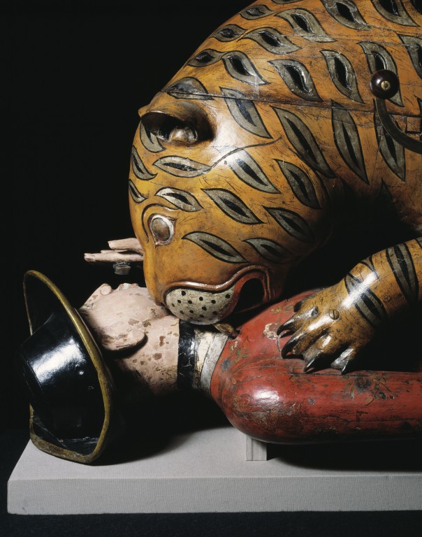 손잡이를 돌리면 내부의 기계 장치가 작동한다. 풀무가 인물의 목 안쪽 파이프를 통해 공기를 내보내 피해자의 비명을 흉내 내는 울부짖는 소리를 낸다. 기계식 연결 장치는 인물의 왼팔을 오르내리게 하고, '울음 파이프'의 음높이를 바꾼다. 호랑이 머리 안쪽의 또 다른 장치는 두 가지 음색의 단일 파이프를 통해 공기를 내보내 호랑이의 포효를 흉내 내는 "규칙적인 그르렁거리는 소리"를 낸다. 호랑이 옆구리의 덮개 뒤에는 2중 정지 파이프 오르간의 작은 상아 건반이 있어 곡을 연주할 수 있다.[11]
