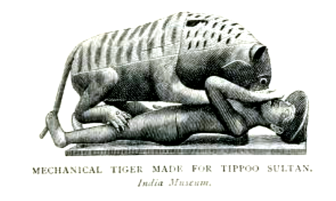 티푸의 호랑이는 1795년경 마이소르 왕국의 통치자 티푸 술탄을 위해 제작된 자동 장치이다. 나무로 조각된 호랑이가 엎드린 유럽인을 공격하는 모습을 하고 있으며, 내부에는 오르간이 있어 호랑이 포효와 사람의 비명 소리를 낸다. 이 기계는 영국군에 의해 노획되어 런던에서 전시되었으며, 19세기와 20세기에 걸쳐 문학, 예술 작품의 영감의 원천이 되었다. 현재는 빅토리아 앨버트 박물관에 소장되어 있다.