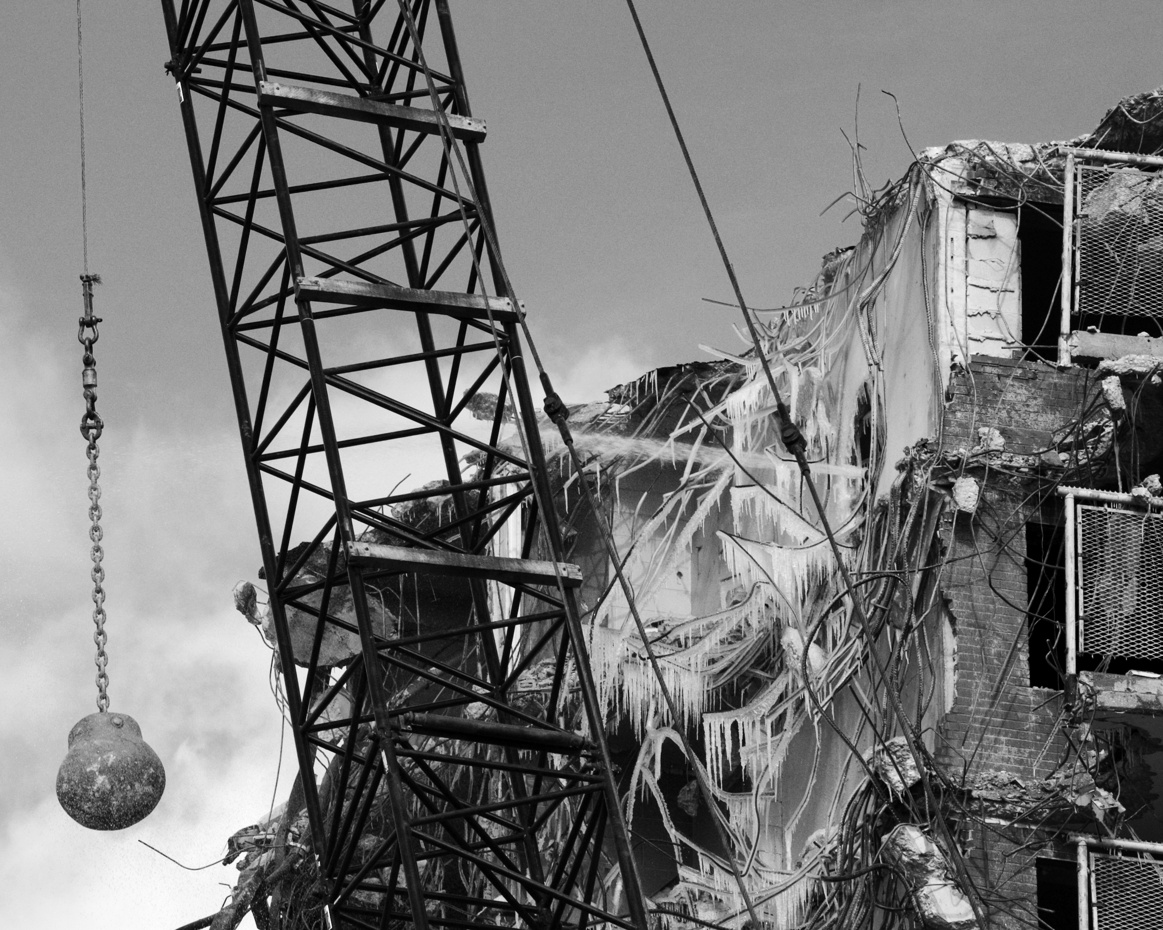 어떤 경우에는 철구가 달린 크레인을 사용하여 구조물을 특정 관리 가능한 높이까지 철거한다. 그 시점에서 위에서 설명한 대로 밑작업이 진행된다. 그러나 크레인에 장착된 철구는 스윙하는 공의 제어할 수 없는 특성과 관련된 안전 문제로 인해 철거에 드물게 사용된다.