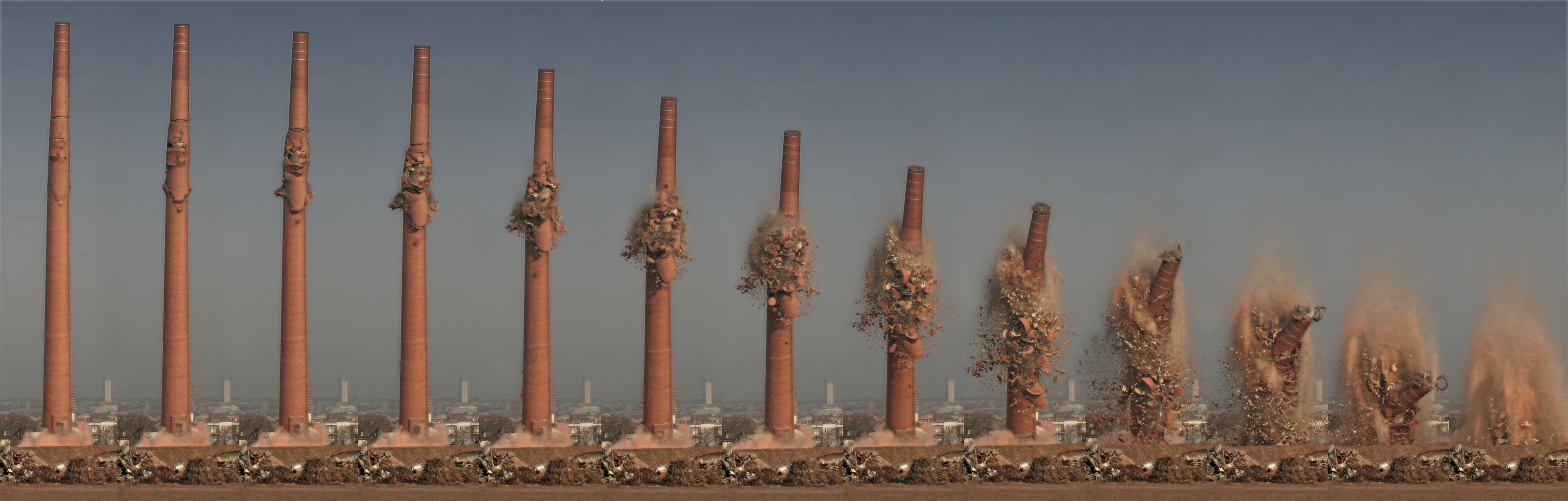 프레드 디브나는 영국에서 산업 굴뚝을 제거하기 위해 수동 철거 방식을 사용했다. 그는 굴뚝 기저부에 입구를 자르고—나무 받침대로 벽돌 공사를 지지하고—받침대를 태워 굴뚝이 떨어지도록 했으며, 폭발물 없이 일반적으로 손으로 작동하는 전동 공구를 사용했다.
