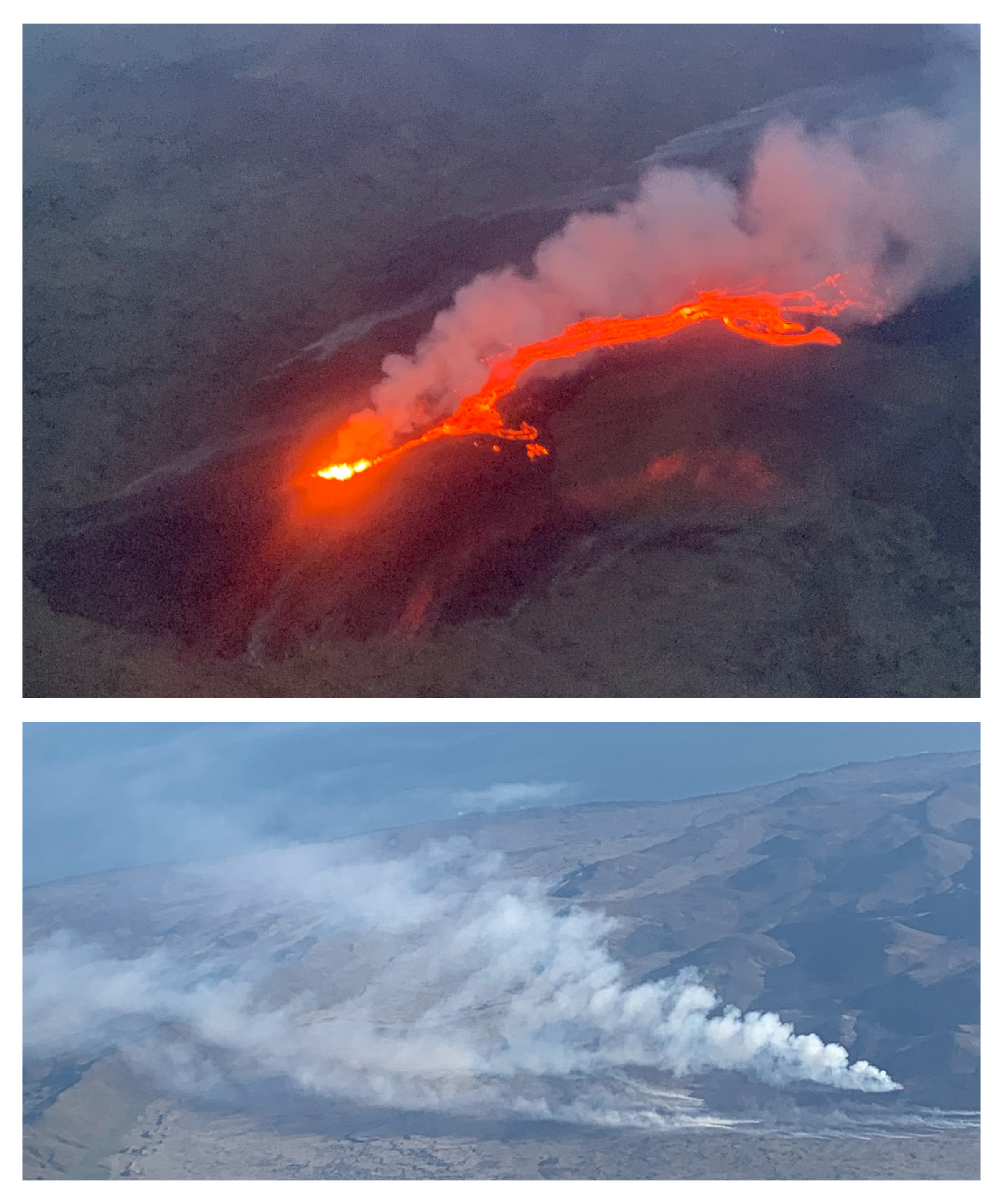 2023년 7월 18일 Litli-Hrútur 분화. 화산은 이제 길쭉한 원뿔 모양이며, 용암은 남쪽으로 흘러 2021년과 2022년의 용암 지대와 만난다.