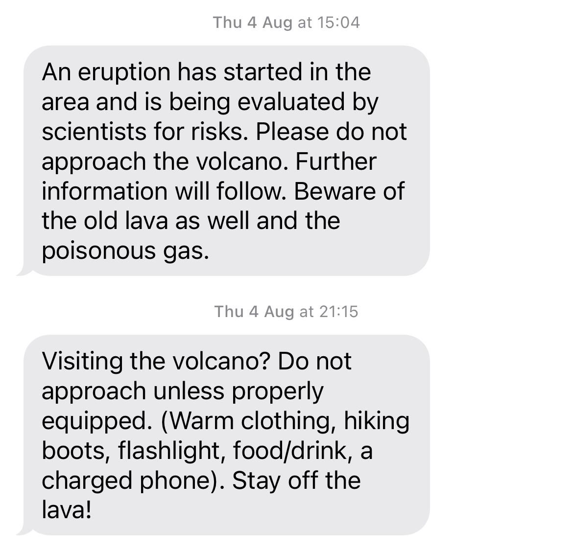 아이슬란드 민방위 및 비상 관리국은 인명이나 기반 시설에 위험이 없다고 밝혔다. 케플라비크 국제공항은 경계 상태를 유지했지만, 항공편 취소는 없었다.[154][155] 지구물리학 교수 마그누스 투미 구드문드손은 초기 용암류를 기준으로 2021년 분화보다 5~10배 정도 더 클 수 있지만 "큰 분화"는 아니라고 평가했다. 용암은 지형상 메라달리르 계곡으로 흘러 들어갈 가능성이 높았다.[158]