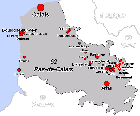 파드칼레주 내 인구 1만 명 이상의 코뮌 분포도