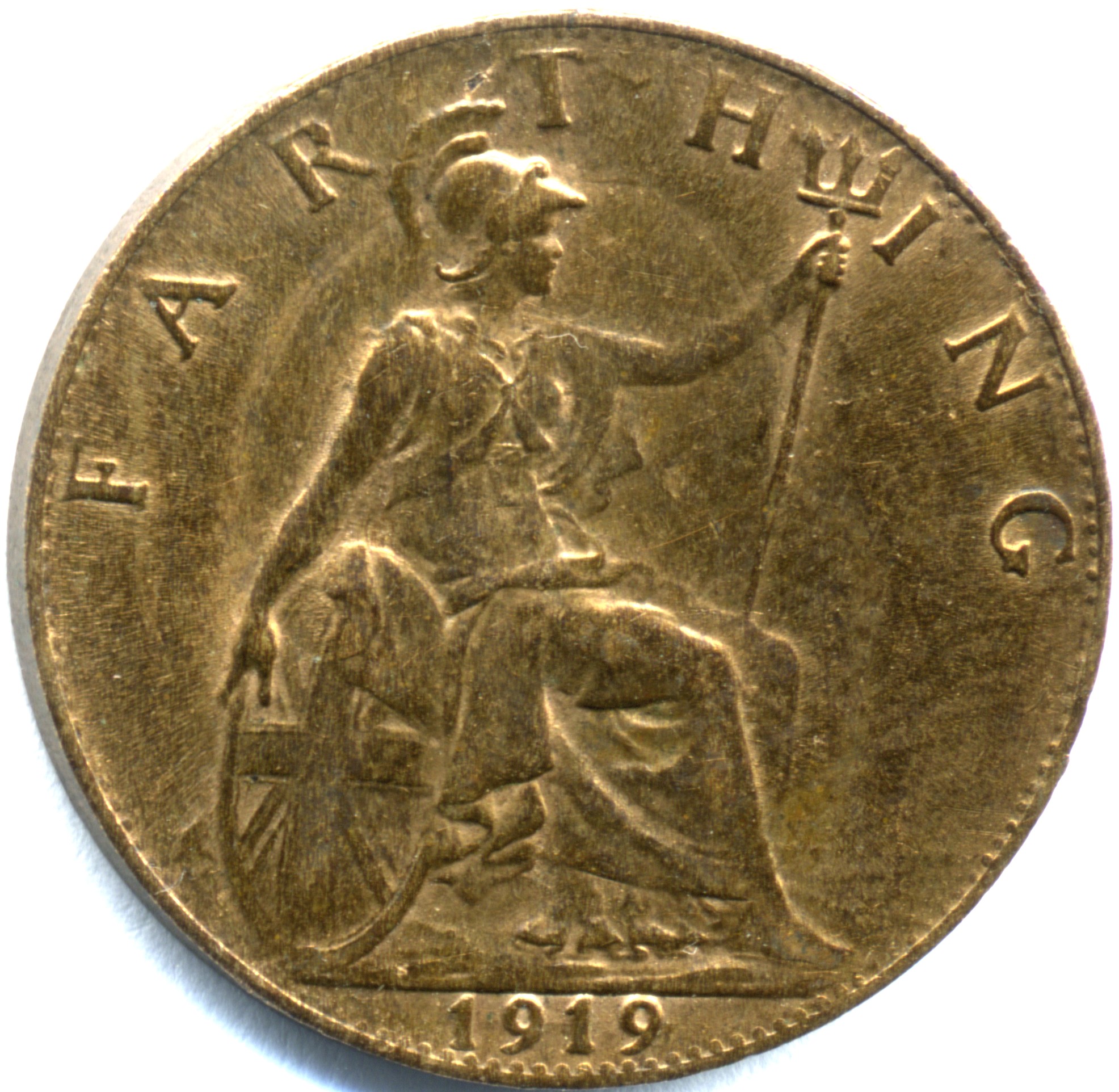 초기 주화의 뒷면은 레오나르도 찰스 와이온이 디자인했으며, 삼지창을 든 브리타니아가 상단에 FARTHING 문구와 함께 묘사되었다. 1895년 이전에는 브리타니아 왼쪽에 등대, 오른쪽에 배가 그려져 있었다. 브리타니아 주변의 해수면에는 다양한 미세한 수정이 가해졌다. 브리타니아의 삼지창 각도 또한 여러 해에 걸쳐 수정되었다. 주화의 측면이 톱니 모양이거나 테두리가 있는 것도 존재했다.
