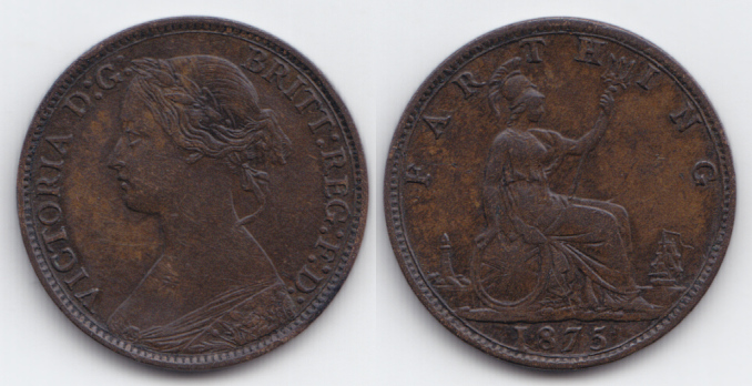 최초의 청동 파딩은 빅토리아 여왕 시대인 1860년에 레너드 찰스 와이언이 디자인한 새로운 뒷면과 함께 주조되었다. 이것은 삼지창을 든 채 앉아 있는 브리타니아를 보여주며, 그 위에 FARTHING이라는 단어가 새겨져 있다. 1860년과 1895년 사이에 브리타니아의 왼쪽에 등대가 있고 오른쪽에 배가 있다. 브리타니아 주변의 바다 높이와 삼지창의 각도에 대한 다양한 사소한 조정이 수년에 걸쳐 이루어졌다. 일부 발행본은 동전 가장자리에 톱니 모양을 특징으로 하고, 다른 발행본은 구슬 모양을 특징으로 한다.