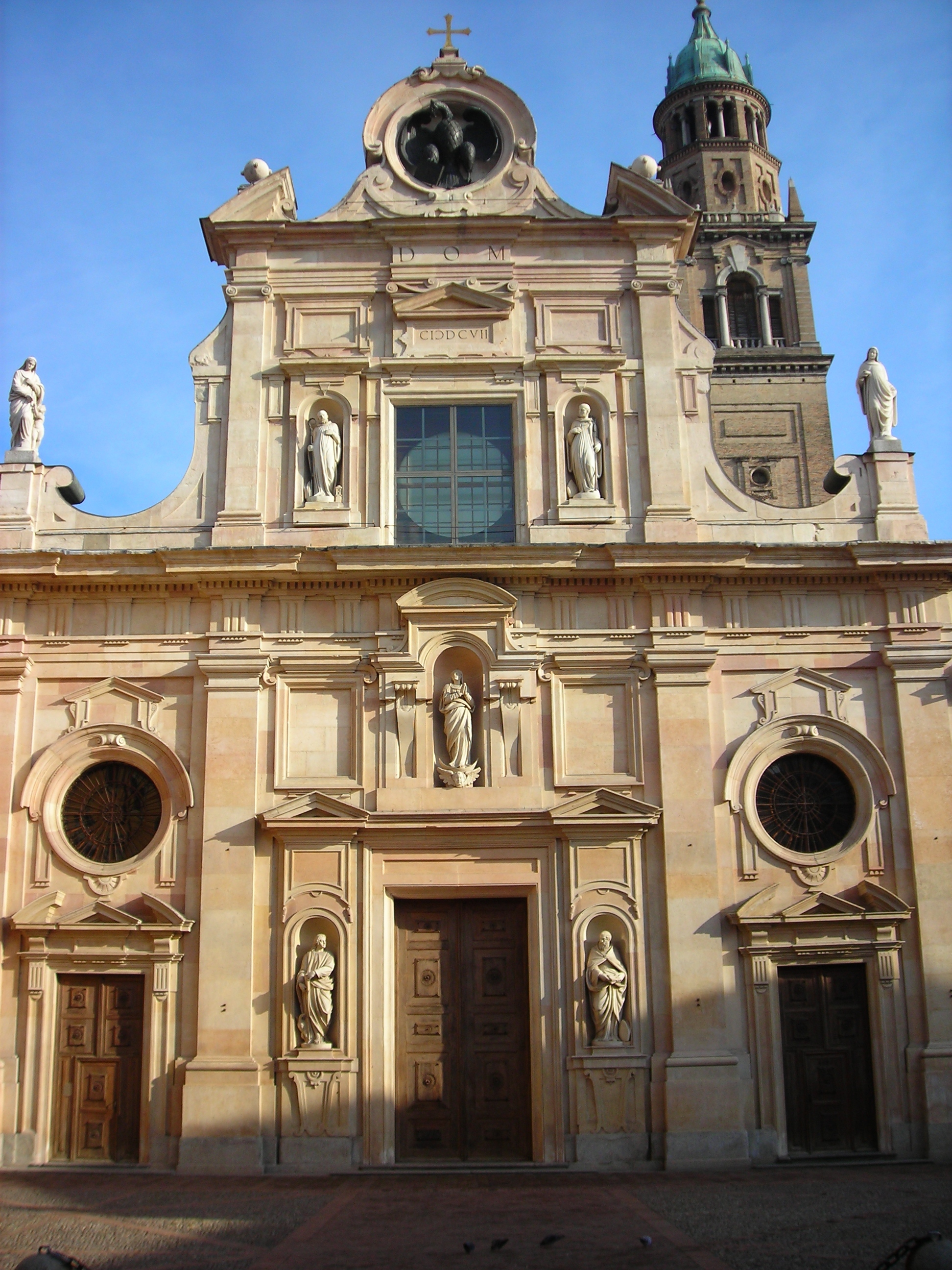 파르마 대성당은 로마네스크 양식의 교회로, 12세기 베네데토 안텔라미의 조각상과 16세기 안토니오 다 코레조의 프레스코화 걸작을 소장하고 있다.[13] 파르마 세례당은 안텔라미가 1196년에 착공하여 대성당 옆에 세워졌다.[13] 산 조반니 에반젤리스타 (파르마)는 대성당 후면에 위치하며, 1498년과 1510년에 재건되었다. 시모네 모스키노가 설계한 후기 마니에리즘 양식의 정면과 종탑을 가지고 있으며, 돔에는 코레조의 「요한 복음사가의 환상」(1520-1522)이 프레스코화되어 있다.[13]