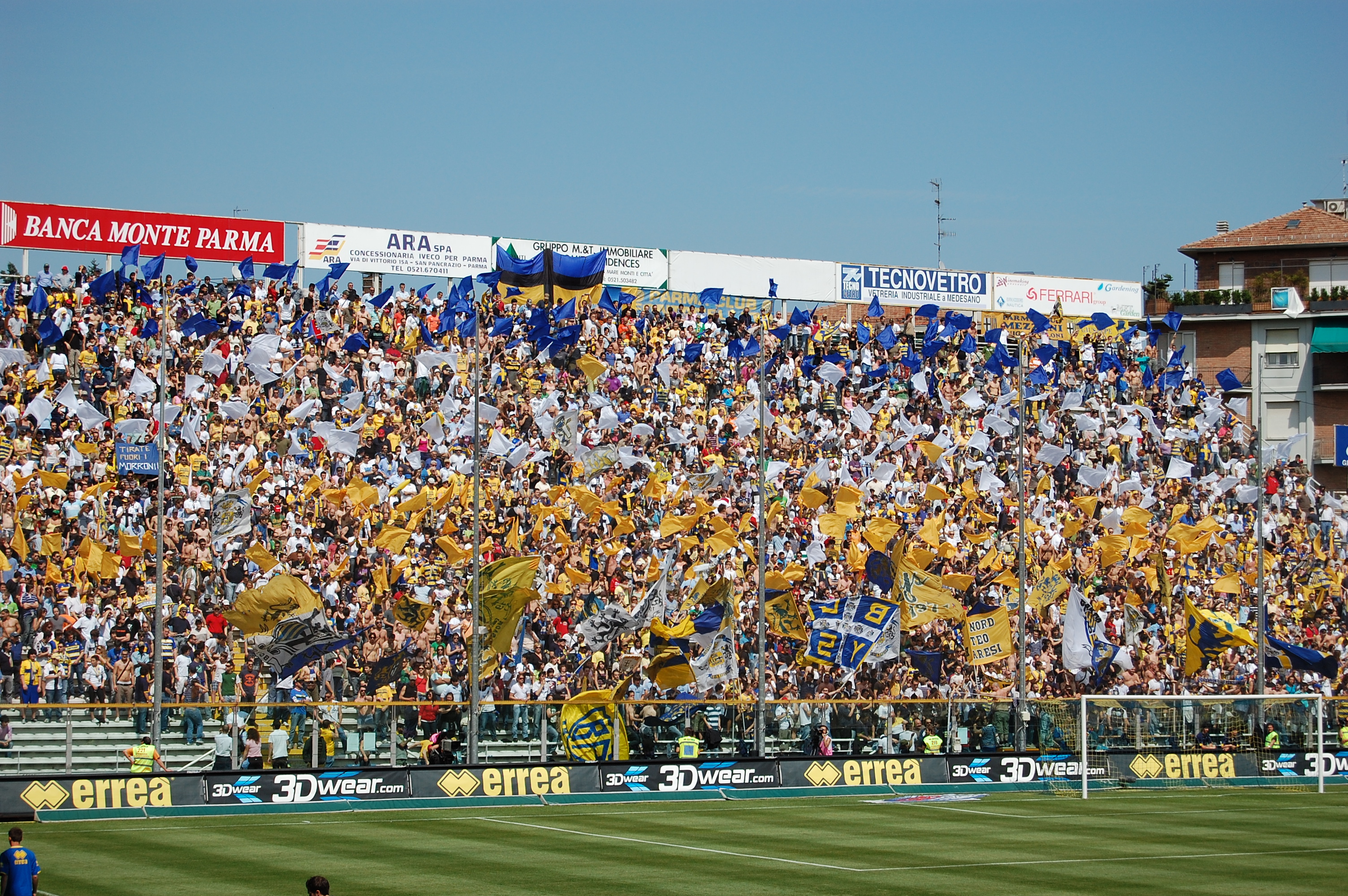 이탈리아에서 가장 오래된 경기장 중 하나인 엔니오 타르디니 경기장에서 파르마 팬들이 응원하고 있다.