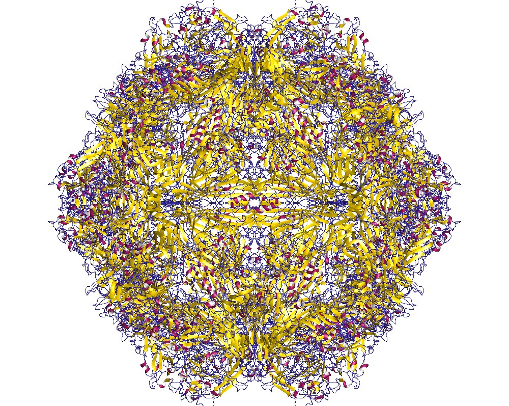 캡시드 표면은 각 2배 축에서 움푹 들어간 부분, 3배 축을 둘러싼 돌출부, 5개의 베타 배럴로 구성된 원통형 돌출부 등의 특징을 보인다. 원통형 돌출부는 5배 축에서 협곡과 같은 함몰부로 둘러싸여 있다.[4] 각 VP 단량체는 8개 가닥의 핵심 베타 배럴 구조(젤리 롤 모티프)를 포함하며, 이는 두 개의 인접한 역평행 베타 시트(CHEF, BIDG)로 배열된다. BIDG는 캡시드 내부 표면을 형성한다.[1][2]