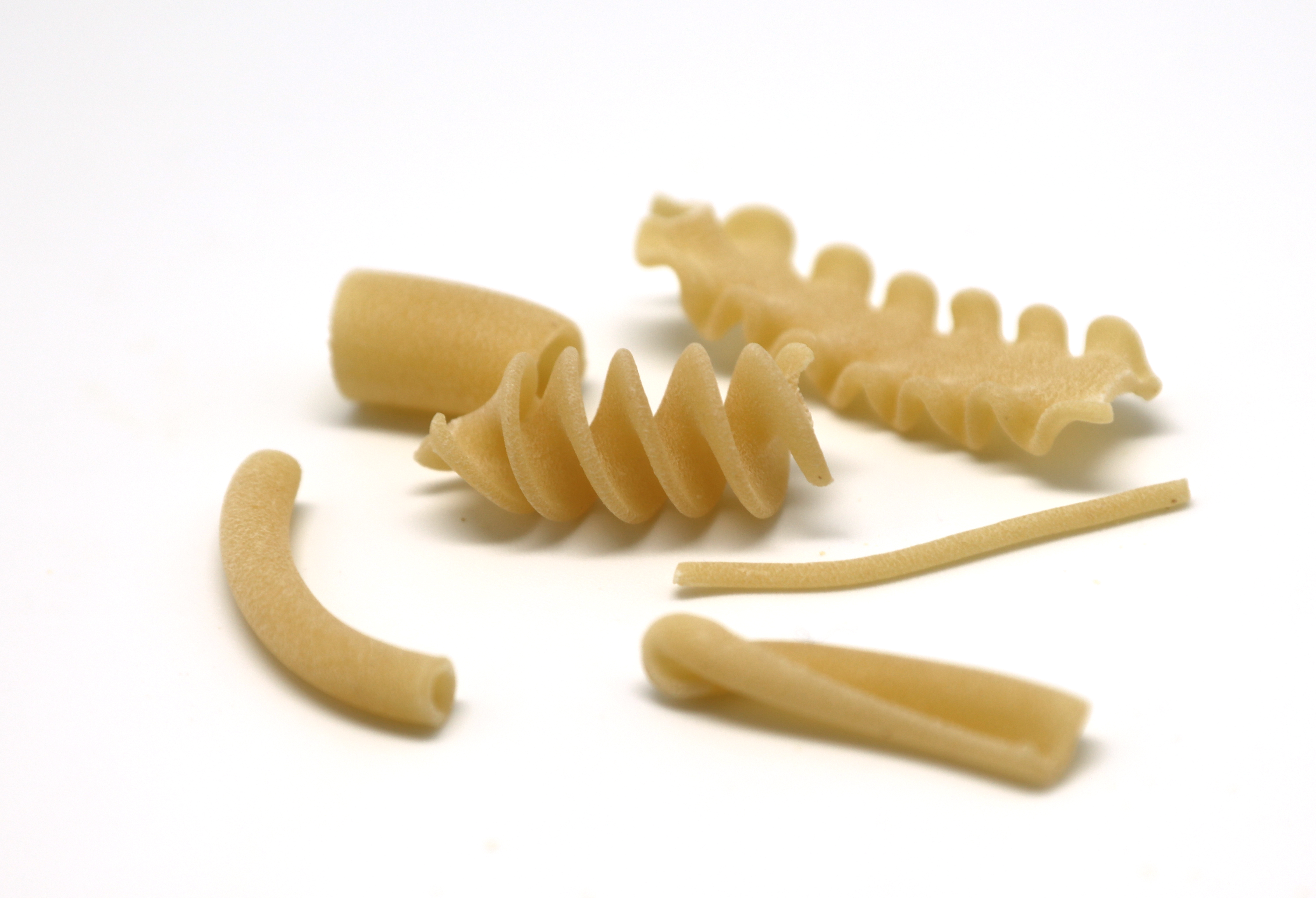 듀럼밀을 갈아서 만든 세몰리나 가루는 광학 스캐너로 분류하고 정제한다.[45] 파이프를 통해 가루가 혼합기에 이동하여 회전하는 날개로 따뜻한 물과 섞입니다. 덩어리진 혼합물이 되면, 혼합물을 얇게 펴거나 압출한다. 스파게티와 링귀니와 같은 파스타는 회전하는 날개로 자르고, 펜네와 푸실리와 같은 파스타는 압출한다. 파스타가 밀려나가는 압출기 다이의 크기와 모양에 따라 최종 모양이 결정된다. 그런 다음 파스타를 고온에서 건조한다.[46]