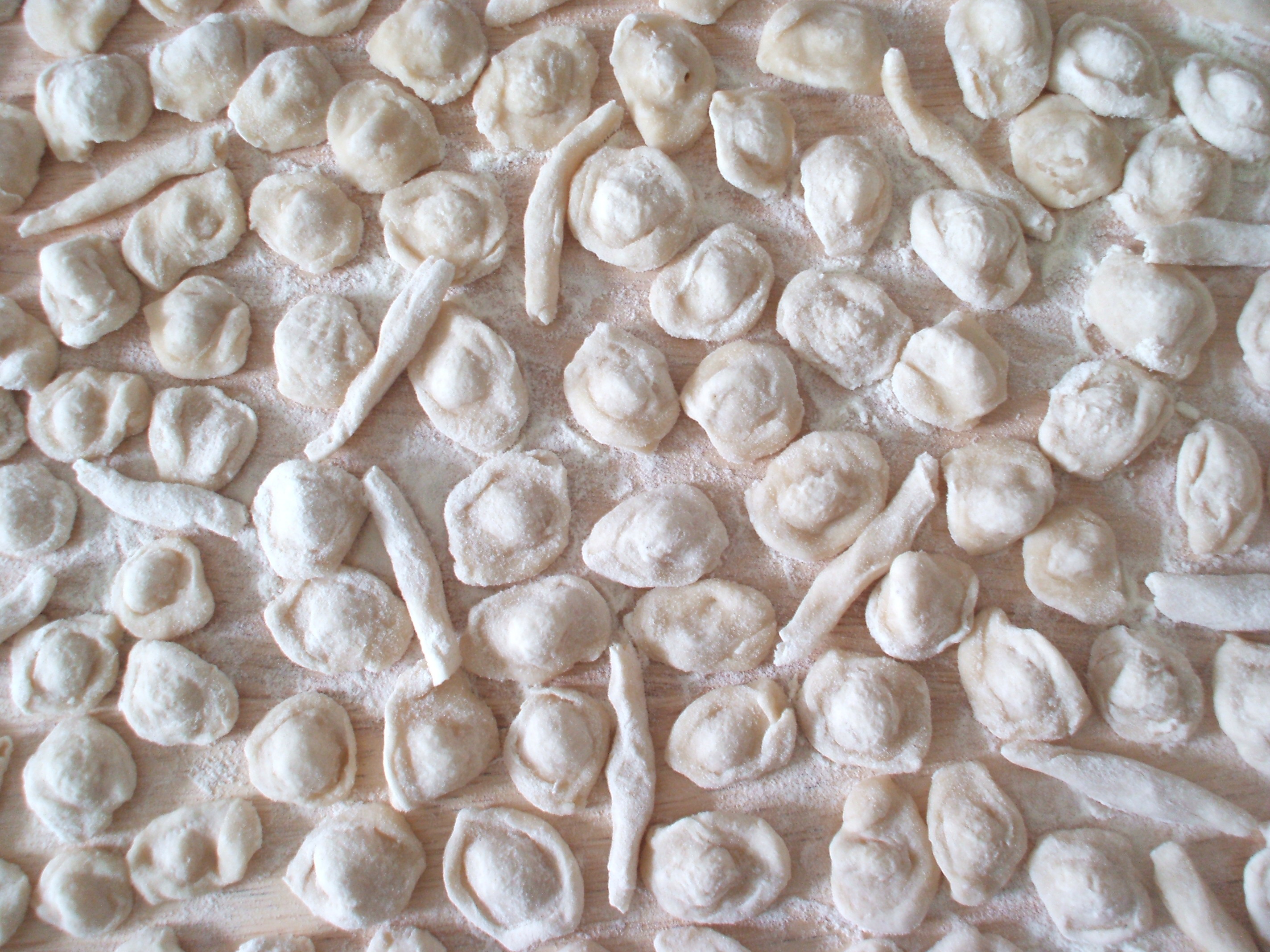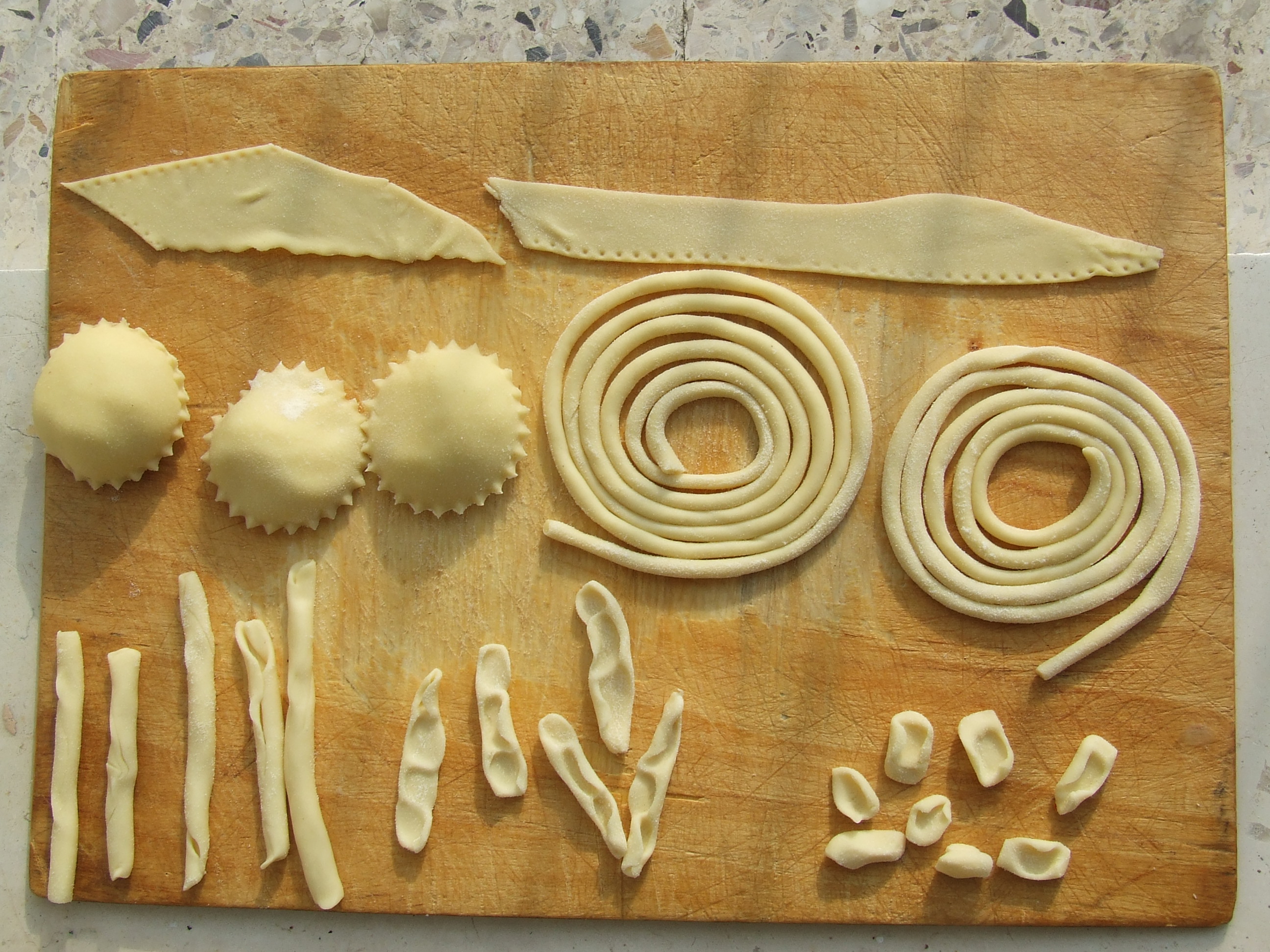 파스타 반죽 재료에는 세몰리나 밀가루, 계란, 소금, 물이 포함된다. 밀가루를 평평한 표면에 쌓은 다음, 밀가루 더미에 구멍을 만듭니다. 그런 다음 계란을 구멍에 붓고 포크를 사용하여 계란과 밀가루를 섞는다.[42]