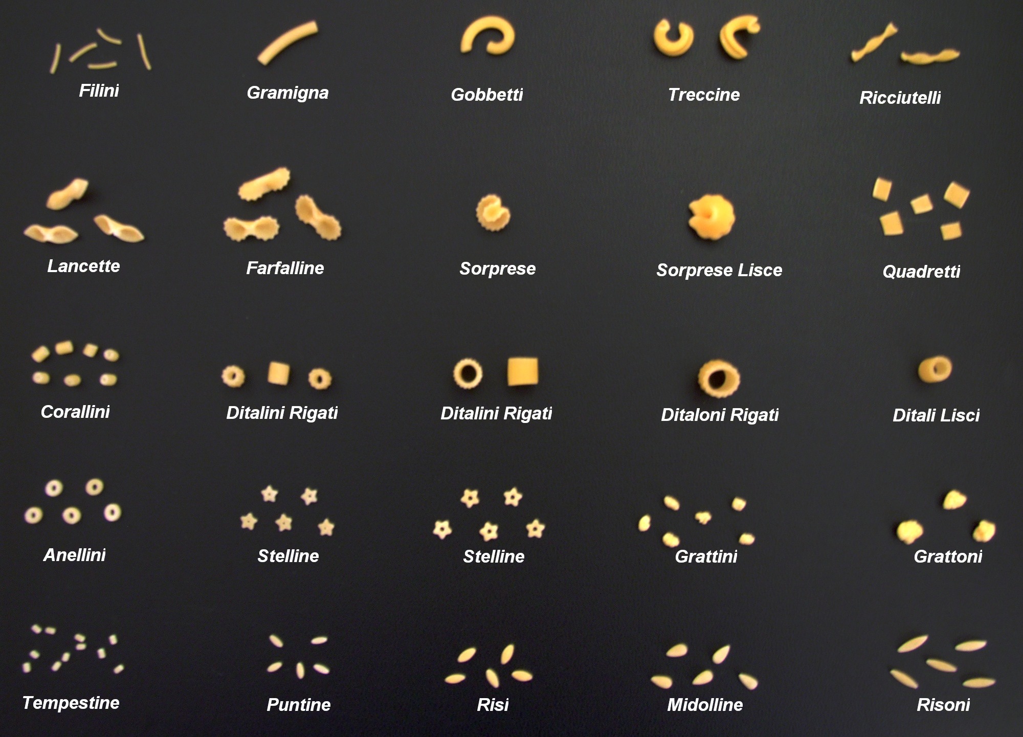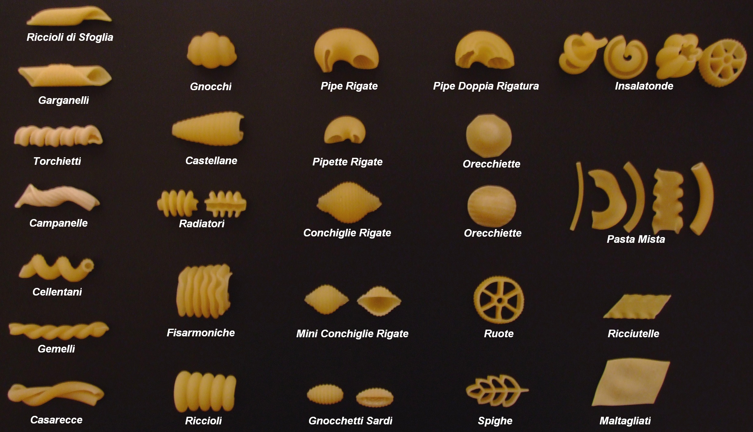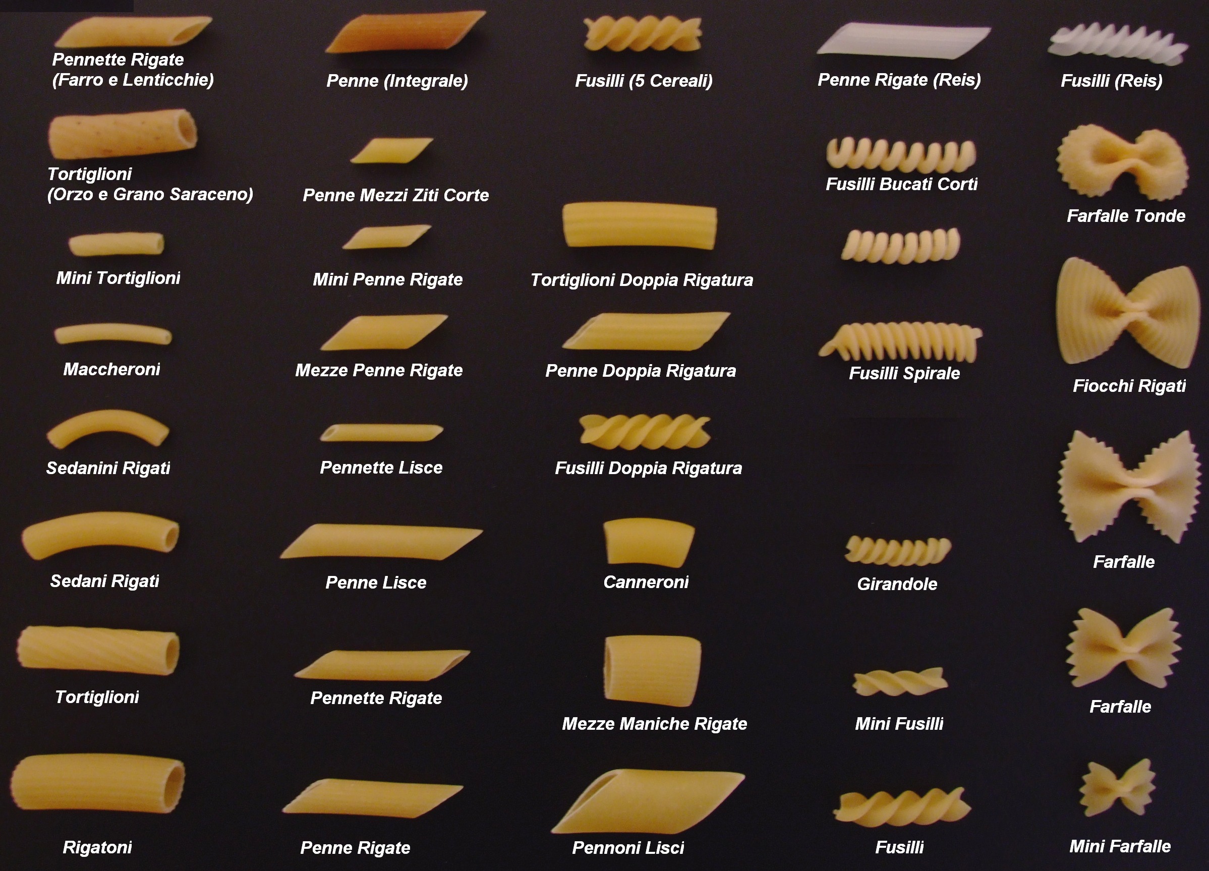 건파스타와 생파스타는 모두 다양한 모양과 변형을 가지고 있다. 파스타의 구체적인 형태는 310개로, 기록된 파스타의 이름은 1,300개가 넘는다.[121] 이탈리아에서 일부 파스타의 모양이나 종류는 지역에 따라 다양하다. 예를 들어 파스타 모양인 카바텔리는 마을과 지역에 따라 부르는 이름이 달라 총 28개의 이름을 가지고 있는 것으로 유명하다. 파스타의 일반적인 모양은 긴 형태, 짧은 형태, 튜브, 납작한 형태, 시트, 수프를 위한 미니어처 형태, 속을 채우는 형태, 지역 특산품, 또는 장식품 등이 포함된다.[122]