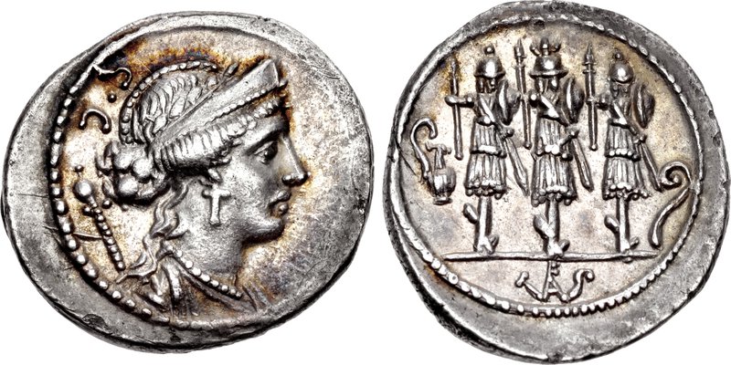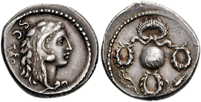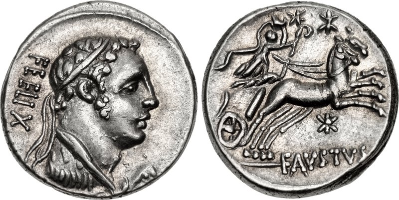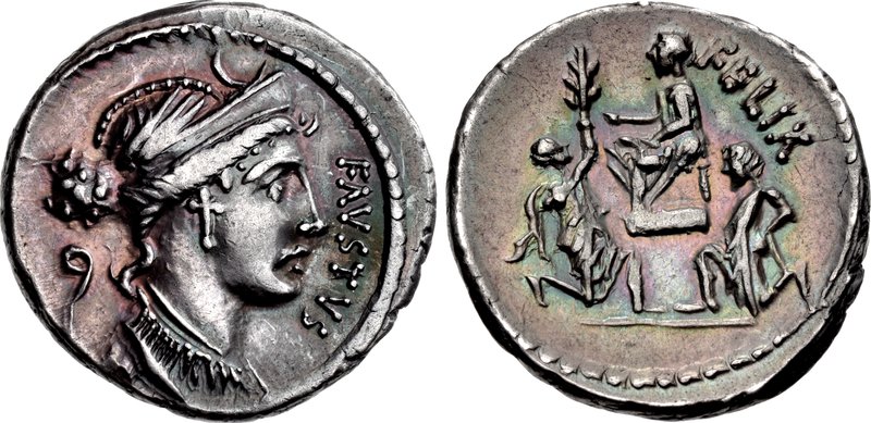- '''비너스/세 개의 트로피''': 나머지 두 데나리우스는 폼페이우스를 기념한다. 파우스투스는 자신의 주화에 자신의 이름을 숨긴 문자로 서명했고, 아버지 술라를 기념하는 데나리우스에는 "파우스투스"라는 이름과 "펠릭스"라는 코그노멘이 새겨져 있었다. 앞면에는 비너스의 머리가, 뒷면에는 세 개의 트로피가 그려져 있다. 이것은 폼페이우스의 인장 반지의 복사본인데, 기원전 86년 카이로네아 전투에서 아르켈라우스를 상대로 승리한 후 만들어진 술라의 두 번째 인장 반지를 모방한 것이다. 술라는 전투 현장에 두 개의 트로피를 세웠고, 이는 그리스 세계에 지속적인 인상을 남겼으며, 파우사니아스와 플루타르코스는 사건 이후 2세기가 지나서도 이를 언급했다.[16] 트로피 양쪽에 있는 리투스와 단지는 폼페이우스가 기원전 59년 이전에 받은 조점관 자리를 암시한다.[17][18] 세 개의 트로피는 폼페이우스가 세 대륙(아프리카, 유럽, 아시아)에서 거둔 승리를 기념하며, 이는 기원전 61년 그의 삼중 개선식에서도 기념되었다.[19]
