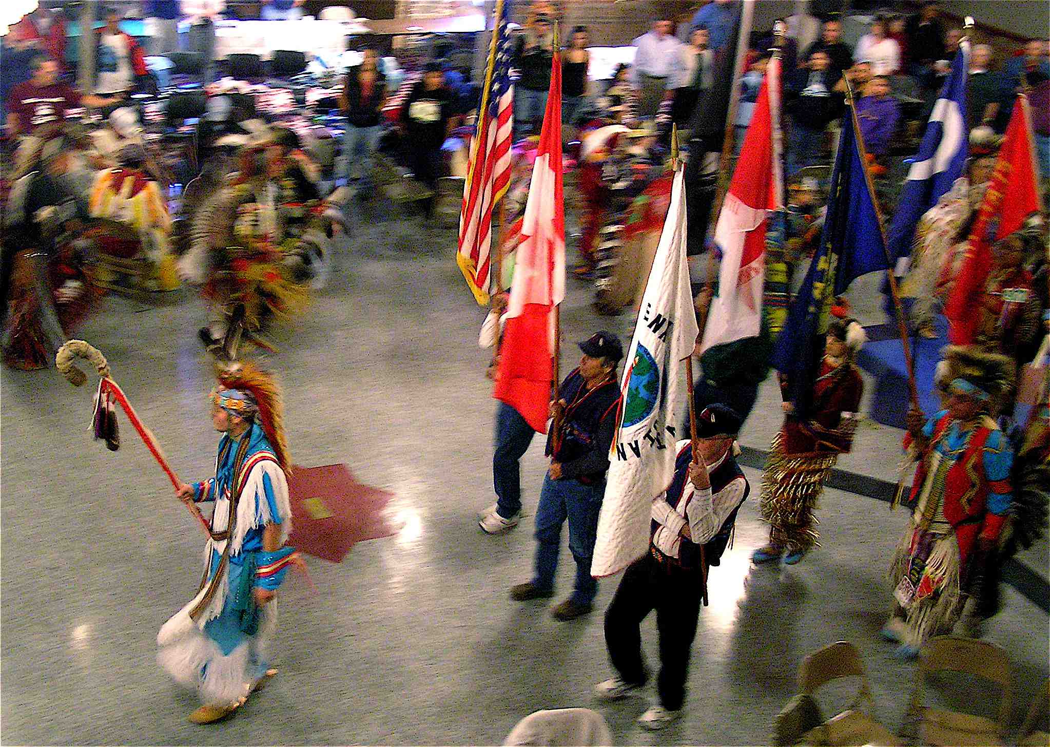 군 참전 용사 또는 현역 군인이 있을 경우, 종종 국기와 독수리 지팡이를 들고 입장하는 영광을 얻는다. 이들 뒤를 이어 주요 무용수들이 입장하고, 그 뒤를 이어 나머지 무용수들이 일반적으로 지정된 순서대로 경기장에 입장한다. 입장 순서는 남성 전통 무용, 남성 그래스 댄스, 남성 팬시 댄스, 여성 전통 무용, 여성 징글 댄스, 여성 팬시 댄스 순이다. 이 순서에 이어 십대와 어린아이들이 같은 순서로 입장한다. 그랜드 엔트리 후 사회자(MC)는 지역 사회의 존경받는 구성원을 초청하여 기도를 올리도록 한다. 그랜드 엔트리 송을 연주하지 않은 호스트 드럼은 국기 송을 연주하고, 그 뒤에 승리 송 또는 참전 용사 송을 연주하는 동안 국기와 지팡이는 사회자(MC)의 테이블에 놓인다.