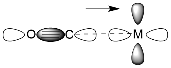 CO의 HOMO에 있는 전자가 금속 중심 d-궤도로 σ 결합을 형성하는 그림