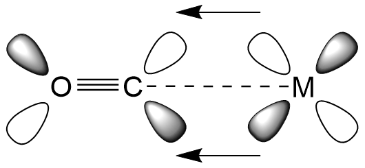금속 중심 d-궤도에 있는 전자가 CO의 LUMO로 π 역결합을 형성하는 그림