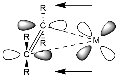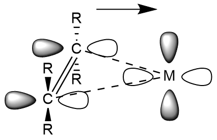 알켄의 HOMO에 있는 전자에서 금속 중심 d-오비탈로의 σ 결합