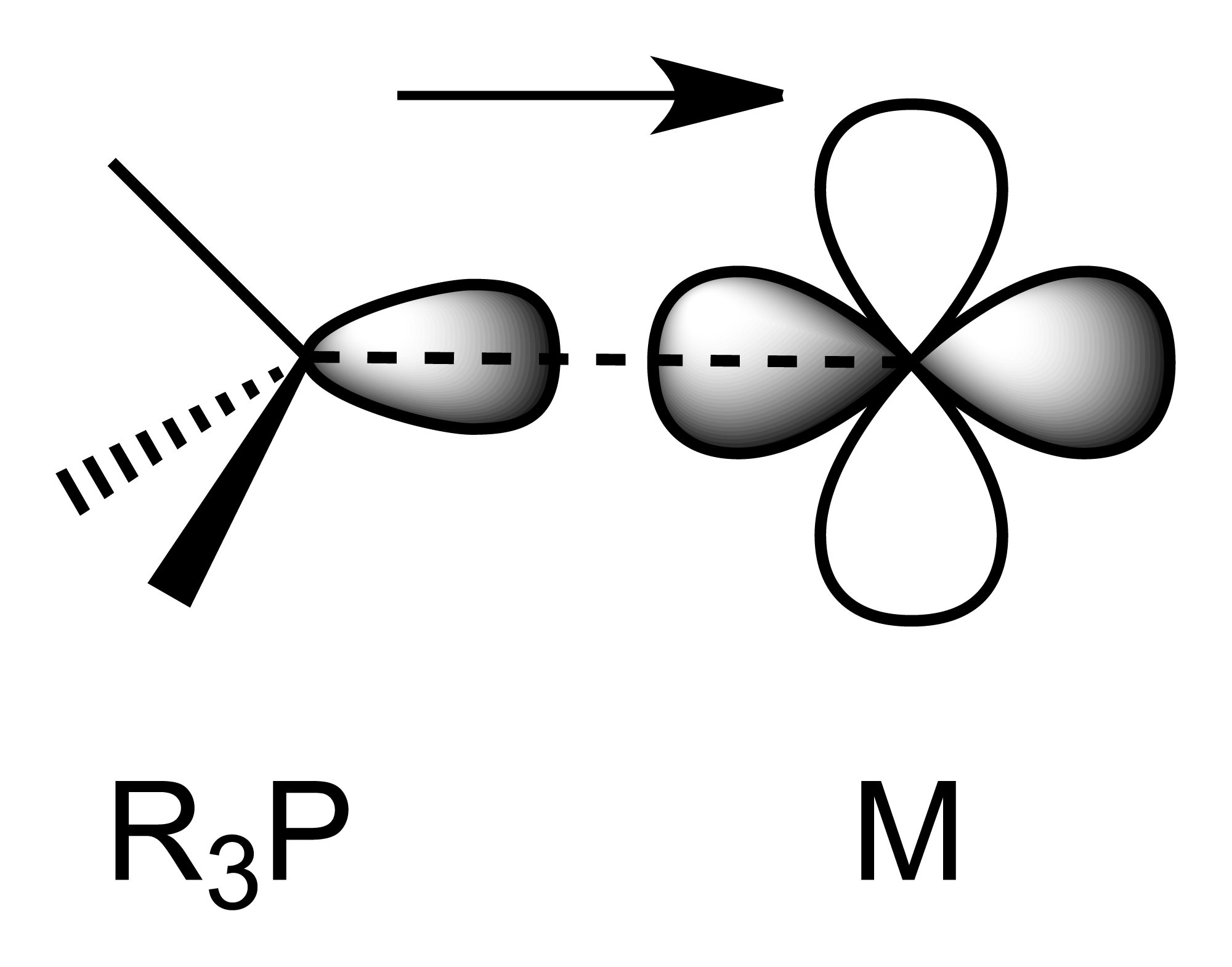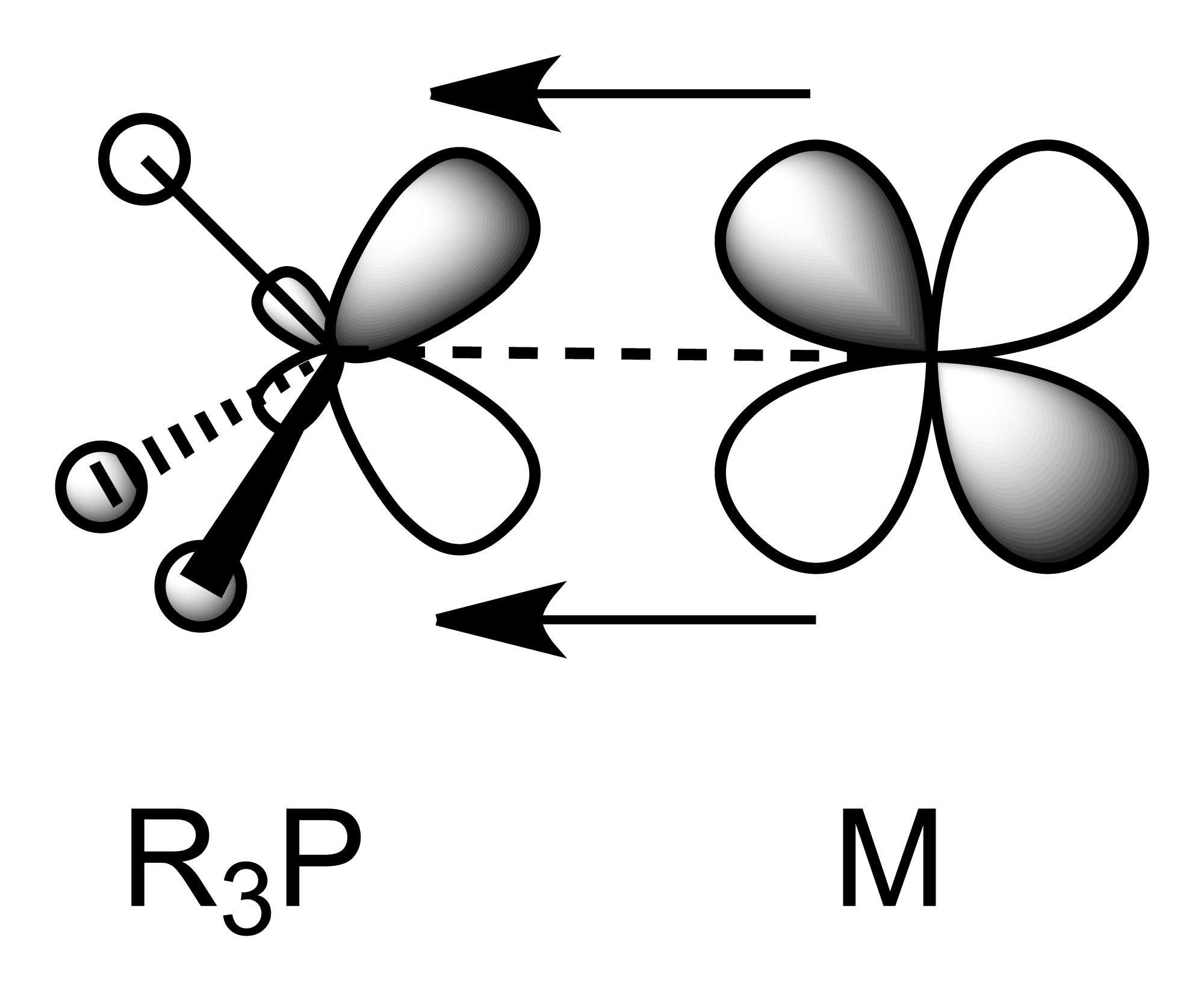 포스핀은 금속 p 또는 d 오비탈로부터 전자 밀도를 π 대칭성을 갖는 P–C σ* 반결합 오비탈의 조합으로 받아들인다.[11] 포스핀이 전자 밀도가 높은 금속 원자와 결합할 때, P–C σ* 오비탈이 전자로 채워지면서 역결합으로 P–C 결합이 길어질 것으로 예상된다. 예상되는 P–C 거리의 증가는 종종 상반된 효과에 의해 가려진다. 인의 비공유 전자쌍이 금속에 기증되면서 P(비공유 전자쌍)–R(결합 전자쌍) 반발력이 감소하여 P–C 결합을 짧게 만든다. 두 효과는 전자 하나만 다른 금속-포스핀 착물의 구조를 비교하여 분리되었다.[12] R3P–M 착물의 산화는 더 긴 M–P 결합과 더 짧은 P–C 결합을 초래하며, 이는 π-역결합과 일치한다.[13] 초기 연구에서는 포스핀 리간드가 M–P 파이 결합을 형성하기 위해 3d 오비탈을 사용한다고 생각했지만, 현재는 인의 d 오비탈은 에너지가 너무 높아 결합에 관여하지 않는 것으로 받아들여지고 있다.[14][15]