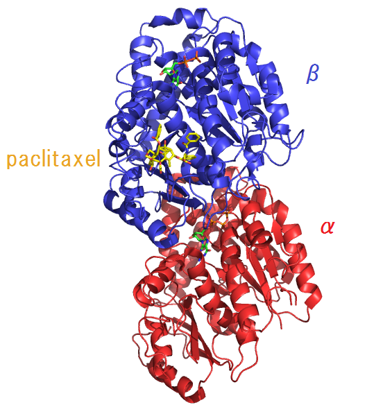 파클리탁셀이 방추사 기능을 억제하는 능력은 미세소관 기능 억제를 통해 발생하는데,[103] 다른 연구들에서는 유사분열을 차단하는 데에 필요한 농도보다 낮은 농도에서 미세소관의 억제가 발생한다고 밝혔다. 보다 높은 치료 농도에서 파클리탁셀은 유사분열에서 정상적으로 활성화되는 과정인, 중심체에서 미세소관이 떨어져 나오는 과정을 억제한다.[104] 파클리탁셀은 미세소관의 베타-튜불린 소단위체에 결합한다.[105]