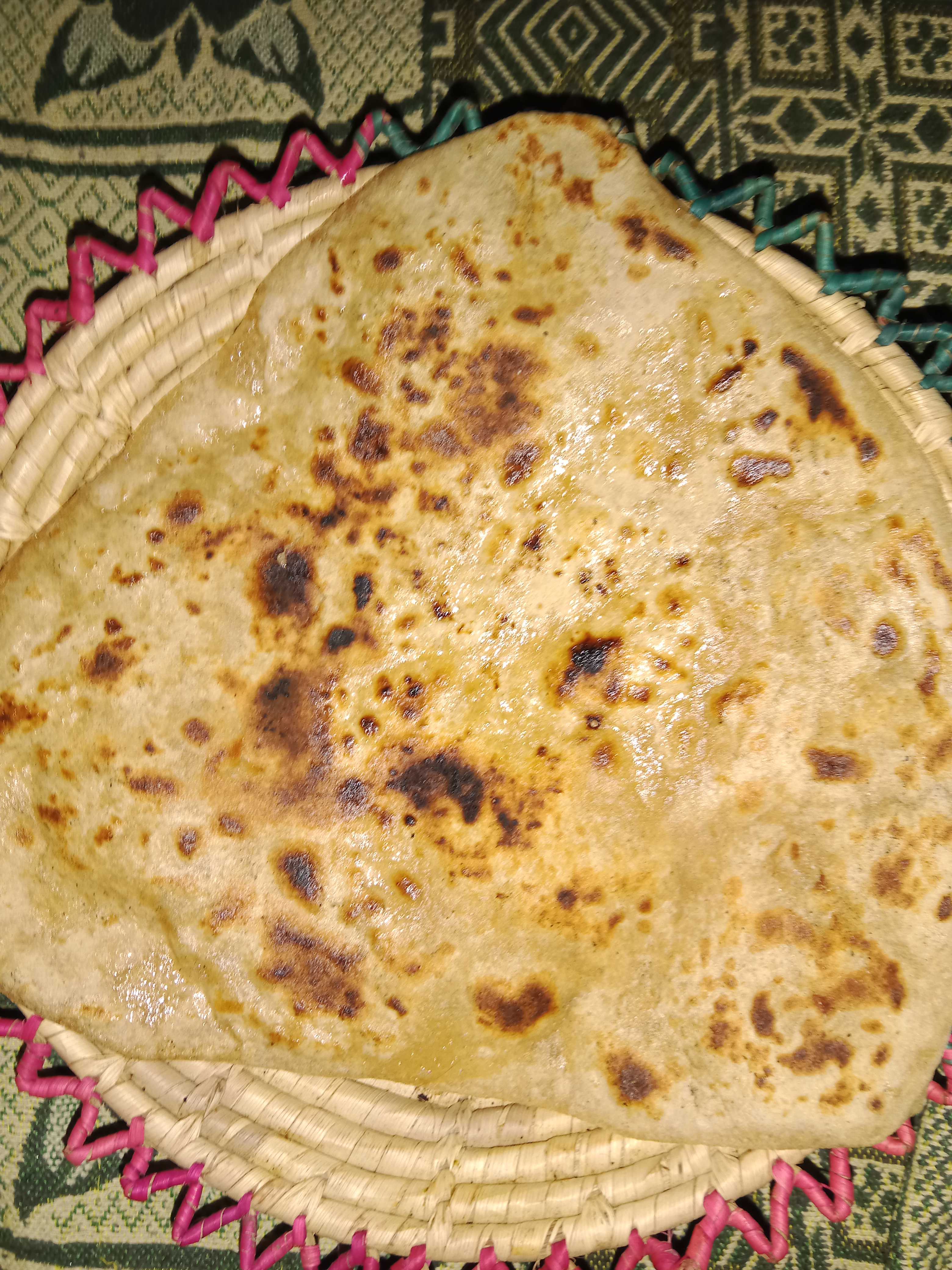 파라타 - 기 또는 식용유로 만든 겹겹이 쌓인 빵으로, '타바'에서 조리된다. 탄두르 기반 버전도 시골 지역에서 흔하다. 페이스트리 반죽과 유사하며, 펀자브 지역에서 유래되었을 가능성이 높다. '알루 카 파라타'(감자 속 파라타), '물리 카 파라타'(무 속 파라타), '키마 카 파라타'(다진 고기 속 파라타) 등 다양한 속을 채운 버전이 있다.
