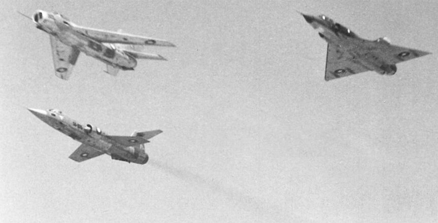 1971년 방글라데시 독립 전쟁으로 이어진 1971년 인도-파키스탄 전쟁에서는 11월 22일, PAF F-86기들이 국제 국경 근처 가리푸르에서 인도군과 무크티 바히니 진지를 공격하며 교전이 시작되었고, 이 과정에서 PAF F-86기 2대가 격추되고 1대가 손상되었다.[29] 12월 3일, PAF는 칭기즈 칸 작전으로 명명된 대규모 선제 공습을 감행했으나, IAF가 이를 예상하고 대비하여 큰 피해를 입히지는 못했다.[30] 이후 PAF는 주로 방어적인 임무를 수행했다.[31] 전쟁은 12월 17일 다카 함락 후 공식적으로 종료되었으며, PAF는 약 2,840회 출격하여 IAF 항공기 71대를 파괴하고 자국 항공기 43대를 잃었다고 보고되었다.[32]