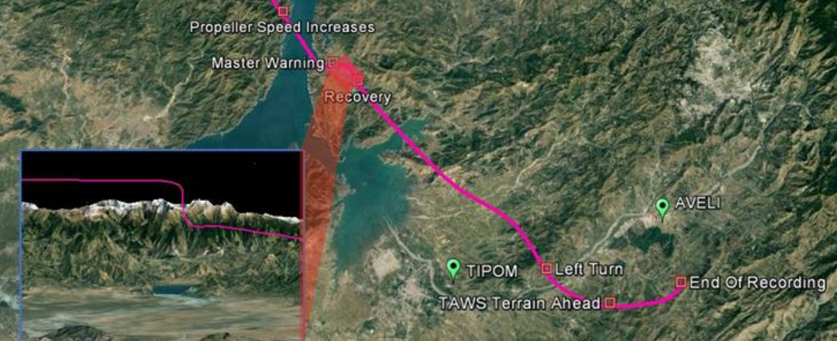 자누자 기장은 왼쪽으로의 회전을 막으려 애썼지만, 왼쪽 측면의 큰 저항 때문에 조종사들은 조종 장치에 큰 오른쪽 입력을 해야 했다. 그러나 회전은 더욱 통제 불능 상태가 되었고, 속도는 계속 떨어졌다. 항공기는 계속 고도를 잃었고, 산악 지형에 가까워졌다. 자누자 기장은 과도한 오른쪽 회전 입력을 주고 오른쪽 엔진의 추력을 조절하여 날개를 수평으로 유지하고 산을 피하려 했지만, 그는 그 시점에는 더 이상 항공기가 산을 넘을 수 없다는 것을 깨닫지 못했다. 지형 경고 시스템은 승무원에게 지형과의 충돌을 경고했고, 승무원들은 고도를 유지하며 필사적으로 항공기를 산에서 구하려 했다.[6]