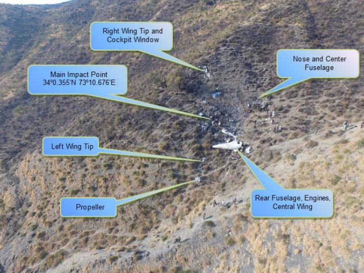 항공기는 마침내 위험할 정도로 낮은 속도에 도달했고, 실속 경고가 조종석 내부에서 다시 울렸다. 지상 259m에서 왼쪽 날개가 완전히 실속했고, 항공기는 왼쪽으로 90도 뱅크하며 산으로 급강하했다. 항공기는 256km/h의 속도로 지면에 충돌하여 산산이 부서졌다. 사고는 오후 4시 15분경에 발생했으며, 파키스탄 군수 공장 근처인 카이베르 파크툰크와주 하벨리안의 사다 바톨니와 구그 마을 사이 언덕에서 잔해가 불타올랐으며, 공항에서 약 90km 떨어져 있었다. 잔해는 약 2km에 걸쳐 흩어져 있는 것으로 보고되었다.[23][6]