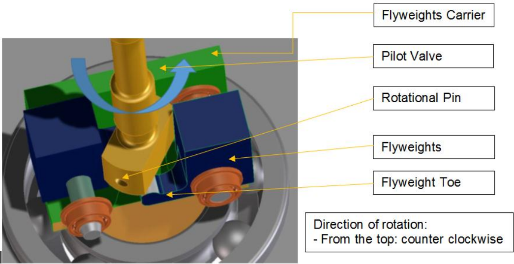 과속 조절기(OSG)는 풍력 발전 현상으로 인한 과속을 방지하는 장치이다.[6] OSG 내부의 플라이웨이트는 플런저를 밀어 올려 밸브를 여는 역할을 하는데, 사고 항공기의 OSG는 핀이 파손되어 플런저가 프로펠러와의 연결을 잃었다.[6] 이로 인해 플런저 모서리가 플라이웨이트에 걸려 금속 피로를 유발했고, 플라이웨이트 중 하나가 비행 전 파손되었다.[6]