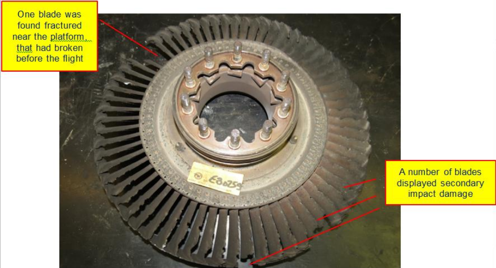 파손된 블레이드는 진동을 발생시켰고, 이 진동은 터빈 샤프트를 통해 전달되어 구성 요소 간의 마찰을 유발, 6번 씰 베어링을 손상시켰다.[6] 손상된 베어링에서 나온 금속 조각은 엔진 오일 시스템으로 유입되어 엔진 성능을 저하시켰다.[6]