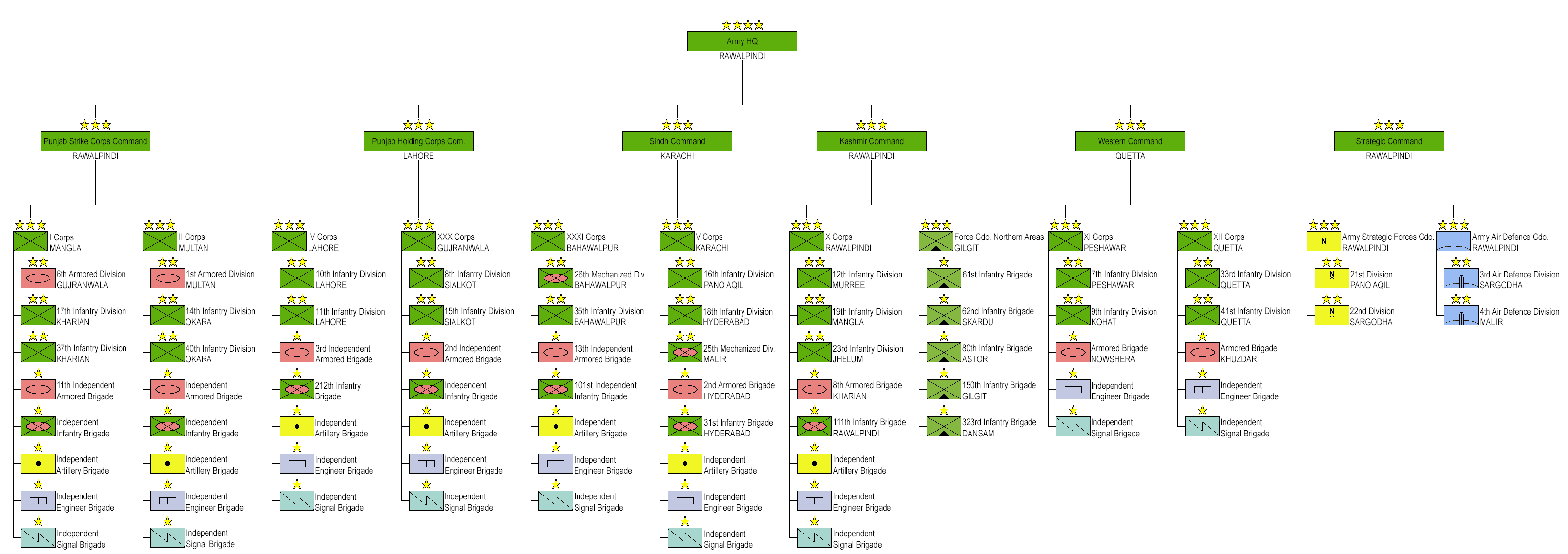 영국령 인도 제국의 분할 당시, 클로드 오친렉 경은 제7, 제8, 제9 사단을 파키스탄 육군으로 이전하는 것을 선호했다.[32] 1948년, 제10, 제12, 제14 사단이 창설되었고, 제14 사단은 동벵골에 창설되었다.[32] 1950년에는 미국 육군의 지원을 받아 제15 보병 사단이 증강되었고, 이후 시알코트에 제15 기병 연대가 창설되었다.[33]