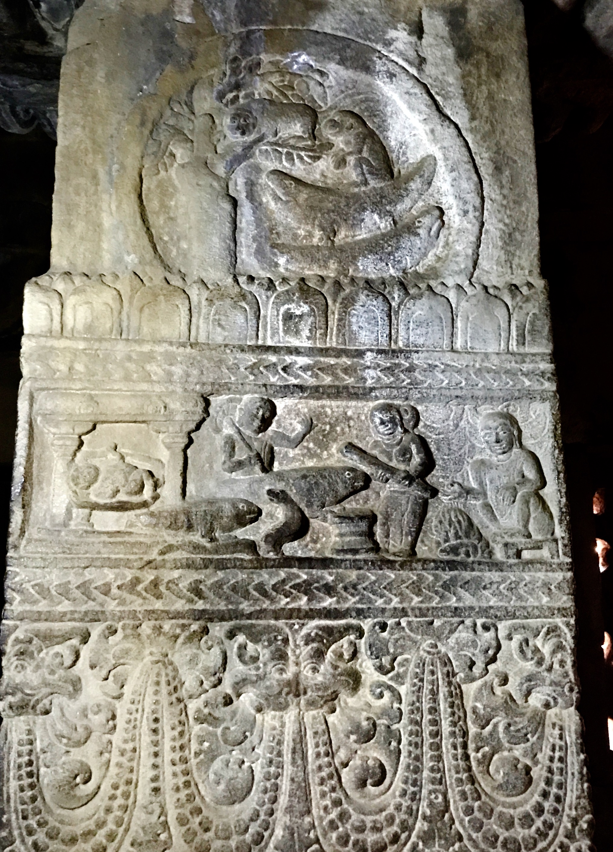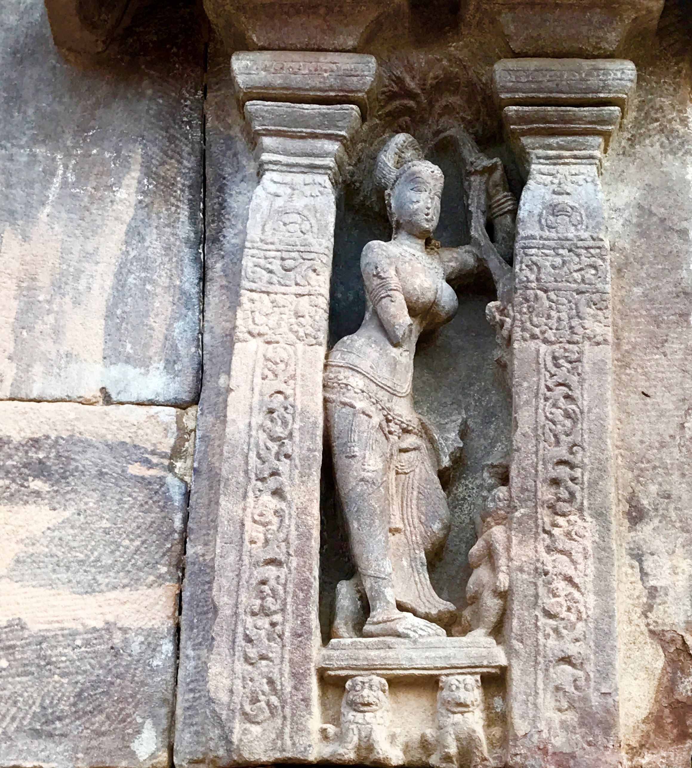 이 사원에는 두 남자가 레슬링을 하는 모습, 리시, 시바와 함께 있는 리시, 연못에 악어에게 갇힌 가젠드라 코끼리를 구출하는 비슈누, 은둔처 장면, 명상 요가 자세를 취하고 있는 사두 등 다양한 주제를 망라하는 수많은 프리즈가 있다. 아루나와 함께 전차를 타는 수리야, 코끼리 위에 탄 인드라 등과 같은 베다 신들도 돌에 새겨져 있다. 앙가다(키쉬킨다 왕국의 발리의 아들)가 라바나의 왕좌보다 높고 마법의 꼬리로 만든 높은 의자에 앉아 있는 모습, 황금 사슴, 하누만, 수그리바, 발리, 라바나와 자타유 새, 시타의 납치, 라마와 락슈마나의 투쟁 등 ''라마야나''의 장면을 묘사한 것도 있다. 다른 프리즈에는 ''마하바라타''의 장면, 캄사에게 갇힌 바수데바와 크리슈나의 탄생, ''바가바타 푸라나''와 ''하리밤사''에 나오는 크리슈나의 유쾌한 이야기, ''판차탄트라'' 및 기타 힌두교 텍스트의 우화가 묘사되어 있다.[30]