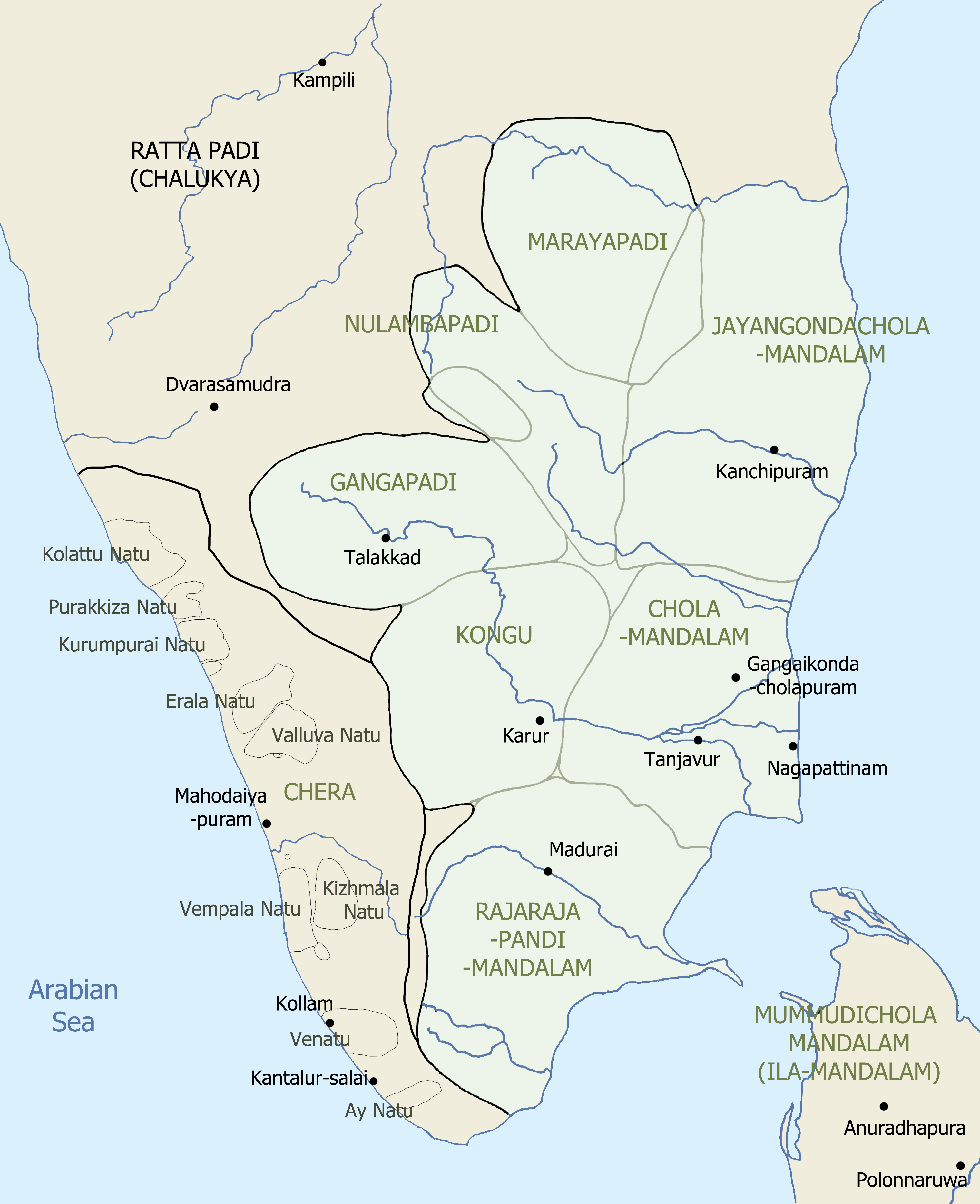 초기 남인도 지역에서는 체라, 판디아, 촐라 세 국가가 타밀라캄에 본거지를 두고 카루르, 마두라이, 우라이유르 등에서 부족 연맹 형태로 번성하였다.[22] 이들은 무지리스, 콜카이, 카베리 등의 항구를 통해 로마 등 유럽 국가들과 무역을 하며[24] 부족 연맹체에서 왕국으로 발전하였다.[25]