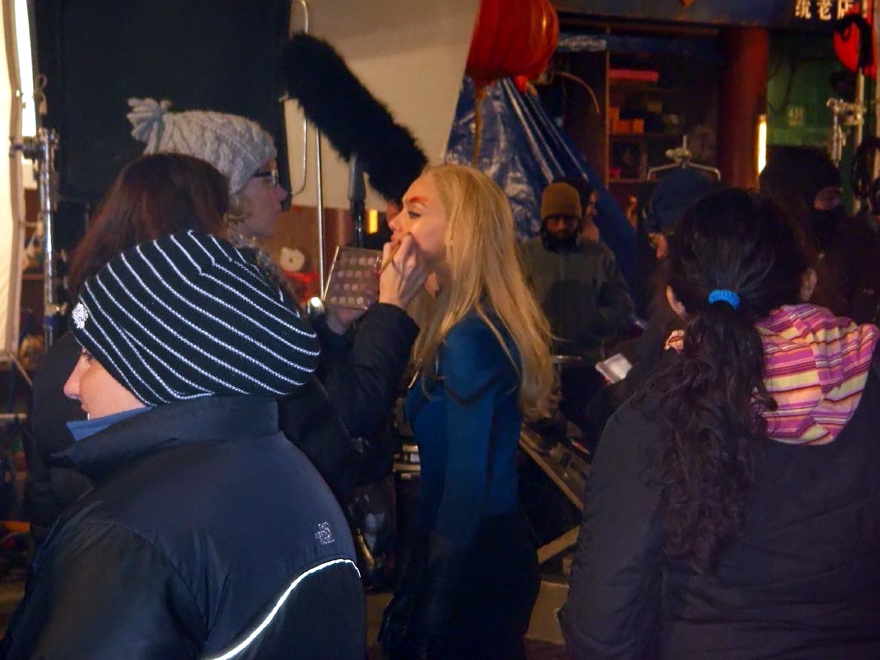 제시카 알바가 촬영장에서 화장을 고치고 있다