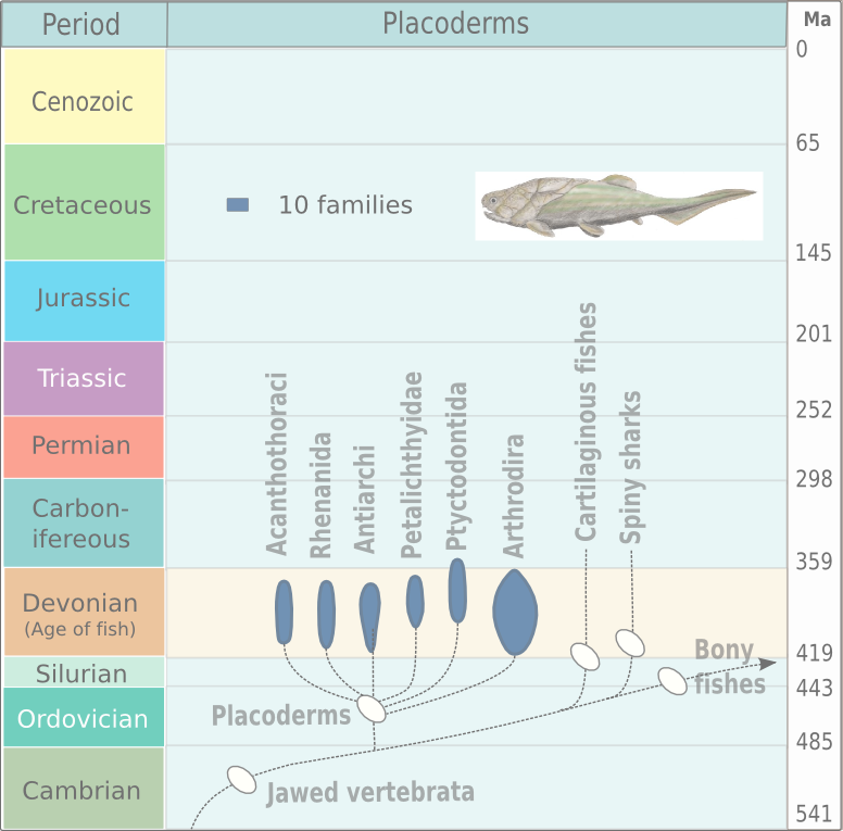 판피어류의 가장 오래된 화석 기록은 실루리아기 전기의 ''Xiushanosteus mirabilis''로 알려져 있으며, 그 기원은 오르도비스기까지 거슬러 올라갈 수 있다고 추정된다.[28] 실루리아기 지층에서의 발견은 드물지만, 데본기에 이르러 판피어류는 크게 번성하여 다양한 종으로 분화했다. 이들은 주로 바다에서 서식하며 전 세계 해역으로 퍼져나갔으나, 일부 종류는 민물 환경에 적응하기도 했다.[29] 또한, 척추동물 중 가장 오래된 태생 방식으로 번식한 그룹(Ptyctodontiformes 목)의 화석도 발견되었다.[30]