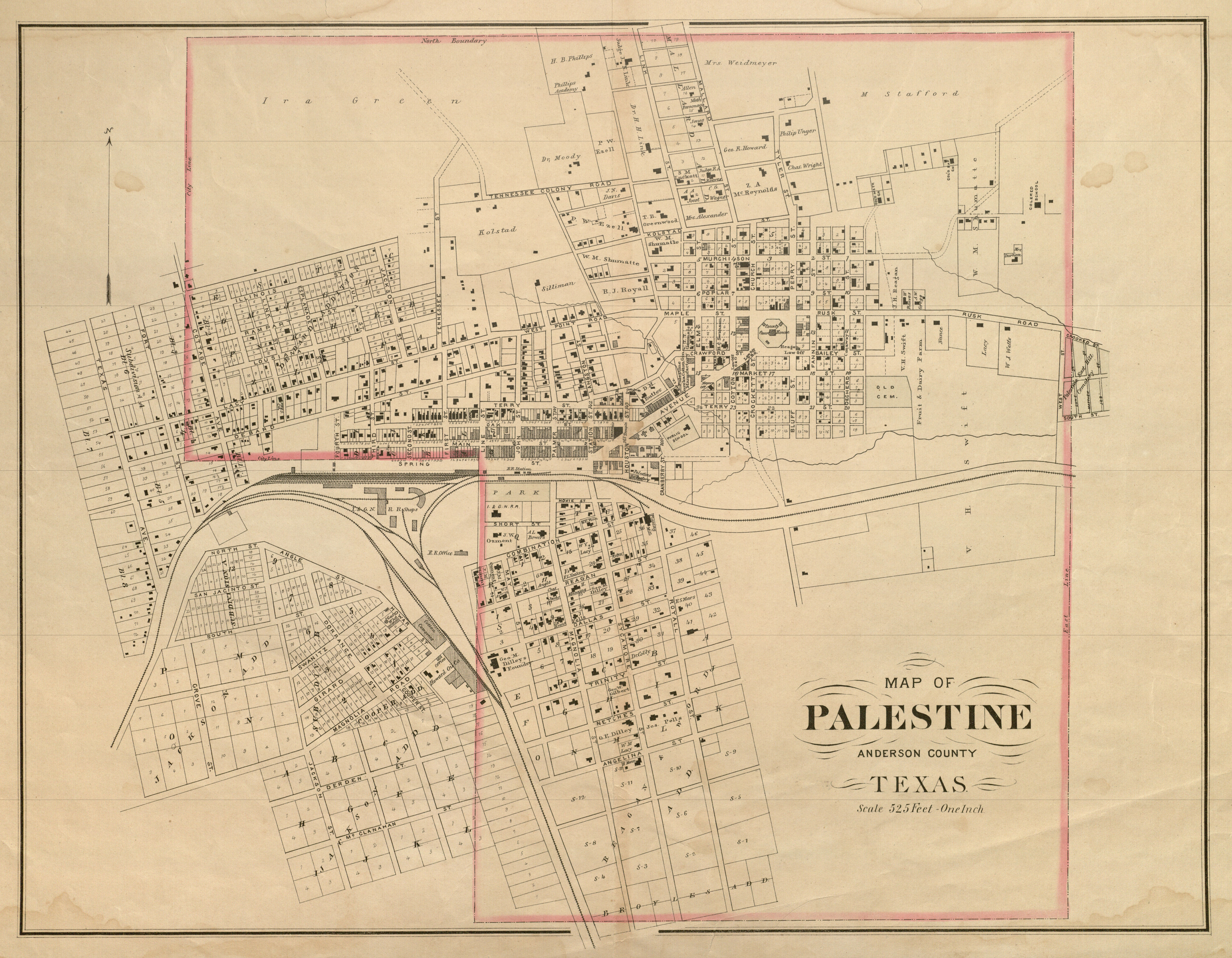 1843년경 앵글로아메리카인들이 무역소를 설립했고, 일부 정착민들이 그 주변에 모여들었다.[8] 1846년, 텍사스 주의회는 새로 설립된 앤더슨 카운티의 행정 소재지 역할을 하도록 팔레스타인을 법인화했다. 제임스 R. 풀턴, 존스턴 쉘턴, 윌리엄 빅슬로우는 초대 앤더슨 카운티 커미셔너에 의해 고용되어 주변 토지를 측량하고 도시 부지를 배치했다. 이 부지는 중앙 법원 광장과 주변 24개 블록으로 구성되었다.[9]이 도시는 일리노이주 팔레스타인의 이름을 따서 지어졌는데, 이는 미참 메인 또는 메인 가족과 그 도시에서 이주한 순례자 교회의 목사인 다니엘 파커의 제안에 따른 것이었다.[10]