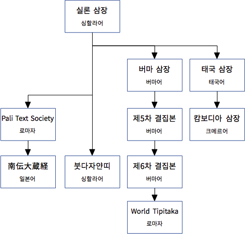 팔리어 대장경은 상좌부 불교의 주요 경전으로, 율장, 경장, 논장의 세 부분으로 구성된다. 율장은 승려들의 규칙을, 경장은 부처의 가르침을 담고 있으며, 논장은 부처의 가르침을 철학적, 심리학적으로 분석한다. 팔리어 대장경은 여러 판본으로 존재하며, 스리랑카, 버마, 캄보디아, 태국 등에서 전승되어 왔다. 남전대장경은 일본어 번역본으로, 1935년부터 1941년까지 다카쿠스 준지로에 의해 간행되었다.